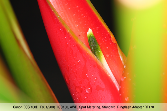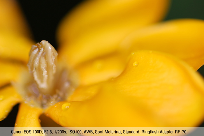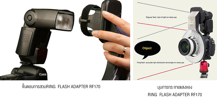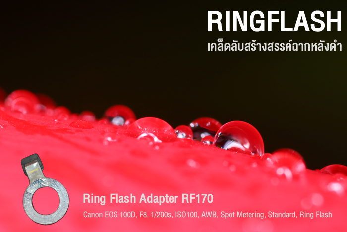 ![]() ภาพมาโครถ่ายอย่างไรให้ตัววัตถุเด่นชัด RING FLASH RF170 อุปกรณ์เสริมแฟลชที่ช่วยเนรมิตแสงแฟลชภายนอกติดหัวกล้องให้กลายเป็นเหมือนแสงประเภท Ringflash ซึ่งมีความโดดเด่นเรื่องการกระจายแสง โอกาสเกิดเงาน้อยมาก แต่เมื่อใช้ร่วมกับการถ่ายภาพมาโครจะช่วยแก้ปัญหาแสงแฟลชส่องมากระทบเลนส์จนเกิดเป็นเงาพาดลงไปที่ตัววัตถุอย่างได้ผล และผลลัพธ์ในด้านแสงสว่างจะปรากฏเป็นเหมือนวงแหวนในหยดน้ำ หรือแววตาตัวแบบอันเป็นเอกลักษณ์สำคัญที่น่าสนใจไม่ซ้ำอุปกรณ์แฟลชประเภทอื่น หากคุณยังประสบปัญหาในเรื่องการใช้แสงส่องเข้าหาวัตถุจากด้านหน้าแล้วเกิดอาการสว่างจ้าควบคุมยากแม้จะใช้ระบบ TTL-Flash เข้าช่วยแล้วก็ตาม ตัวเลือกที่น่าจะเป็นไปได้สำหรับการหาอุปกรณ์เสริมมาช่วยต่อยอดความสำเร็จในราคาคุ้มค่าร่วมกับหัวแฟลชที่คุณมีอยู่แล้ว ![]() RING FLASH RF170 เหมาะสำหรับการถ่ายภาพวัตถุระยะใกล้ อาทิ ดอกไม้ แมลง พระเครื่อง จิวเวลรี่ แม้กระทั่งการถ่ายบุคคลก็ยังสามารถนำไปใช้ได้ สำหรับการเริ่มต้นใช้งานเมื่อประกอบทุกอย่างเสร็จมิติของกล้องด้านหน้าจะกว้างเพิ่มขึ้นกว่าปกติ ดังนั้นต้องพึงระวังอยู่เสมอมิฉะนั้นอาจไปกระแทก หรือเกี่ยวอะไรที่ไม่ตั้งใจได้ กรณีใช้เลนส์นอร์มอลซูม (เลนส์ที่ติดมาพร้อมกล้อง) ต้องระวังช่วงมุมกว้างที่มีโอกาสติดขอบวงแหวนเพราะหน้าเลนส์ยาวออกไปไม่พ้นรัศมี RING FLASH แต่ถ้าเป็นช่วงตั้งแต่นอร์มอลขึ้นไปถึงเทเลโฟโต้จะไม่พบปัญหานี้ ทีนี้เริ่มลองถ่ายภาพในระยะห่างตั้งแต่ใกล้สุดจนไกลเป็นเมตร สิ่งที่เห็นชัดเจนโดดเด่นเป็นเรื่องของแสงเงาที่ทอดตัว และจุดที่แสงกระทบวัตถุทำได้นุ่มนวล ซึ่งแฟลชในตัวไม่สามารถทำได้แบบนี้เพราะวัตถุอยู่ในระยะใกล้เกินกว่าแสงจะกระจายครอบคลุมถึง สำหรับผิวของตัวแบบที่มีความมันวาวต้องระวังการสะท้อนเป็นจุด หรือเส้น วิธีแก้ก็พอมี คือพยายามเบี่ยงมุมไม่ให้แสงสะท้อนผิวโดยตรงเพื่อให้แสงเกิดอาการที่เรียกว่า แฉลบ ขณะถ่ายภาพในมุมก้ม-เงยควรประคองวงแหวนไว้บ้างเพราะแรงโน้มถ่วงโลกทำให้เลนส์ไม่อยู่ตรงกลางอาจถูกกระแทกโดยไม่ตั้งใจ แต่อาการนี้ถ้าประคองเลนส์จนชำนาญแล้วนิ้วมือส่วนหน้าจะสอดรองรับจากใต้เลนส์เหมือนเป็นบัลเบิ้ล (Buble) กันกระแทก ![]() RING FLASH RF170 สร้างแสงเรืองรองทิ้งไว้บนหยดน้ำ สีสันของดอกไม้ก็สดใสตัดกับฉากหลังสีเข้ม ในกรณีที่ฉากหลังมีความสว่างน้อยกว่าตัวแบบมากเกินกว่า 3 สตอป โอกาสได้ฉากหลังเข้มจนดำจึงไม่ใช่เรื่องยาก ยิ่งคราวนี้มีตัวช่วยเสริมเขี้ยวเล็บให้แฟลช การเติมแสงไปที่ดอกไม้ให้เหมือนเป็นการถ่ายภ