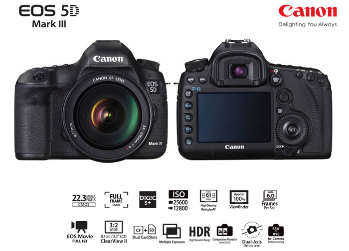 Canon เตรียมเปิดตัวกล้อง EOS 5D MarkIII กล้องชนิด Full-Frame สำหรับมืออาชีพรุ่นใหม่ที่มีประสิทธิภาพการทำงานสมบุกสมบัน ไม่แพ้รุ่นใหญ่อย่าง EOS1DX ด้วยการปรับปรุงฟังก์ชั่นการทำงาน และการประมวลผลให้รองรับระบบการใช้งานของเลนส์ที่หลากหลายประสิทธิภาพให้ใช้งานได้ใกล้เคียงกันยิ่งขึ้น รองรับการทำงานในรูปแบบไร้สาย (Wireless) ทั้งเรื่องของการถ่ายโอนข้อมูล และการสั่งงานแฟลชด้วยระบบคลื่นวิทยุ ลองไปศึกษารายละเอียดเตรียมความพร้อมสำหรับการถ่ายทอดจินตนาการของคุณให้โลดแล่นไปพร้อมกับกล้องที่เปี่ยมไปด้วยเทคโนโลยีทันสมัยอย่าง EOS 5D MarkIII