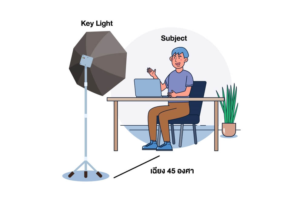 ไฟหลัก หรือที่หลาย ๆ คนเรียกว่า คีย์ไลท์ จะเป็นแสงไฟหลัก ทำหน้าที่ให้แสงสว่างกับ Subject หรือตัวแบบ ตำแหน่งของไฟจะอยู่ด้านหน้าตัวแบบไม่เกิน 1 เมตร และอยู่ในระยะเฉียง 45 องศา พร้อมเปิดไฟเบา ๆ ไม่ต้องแรงมาก แสงที่ได้ก็จะนุ่มนวลมากยิ่งขึ้น