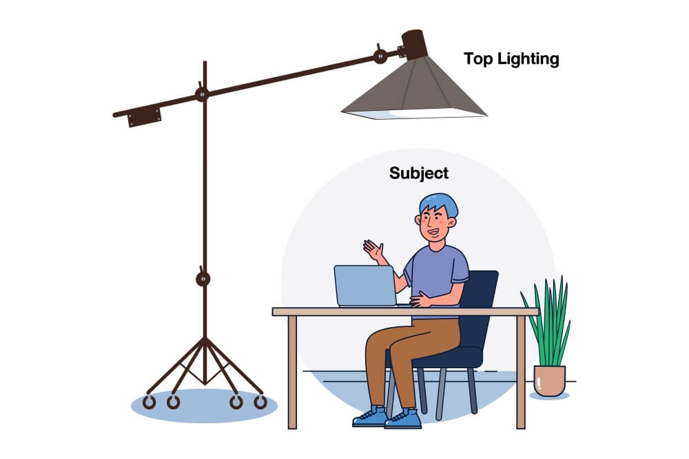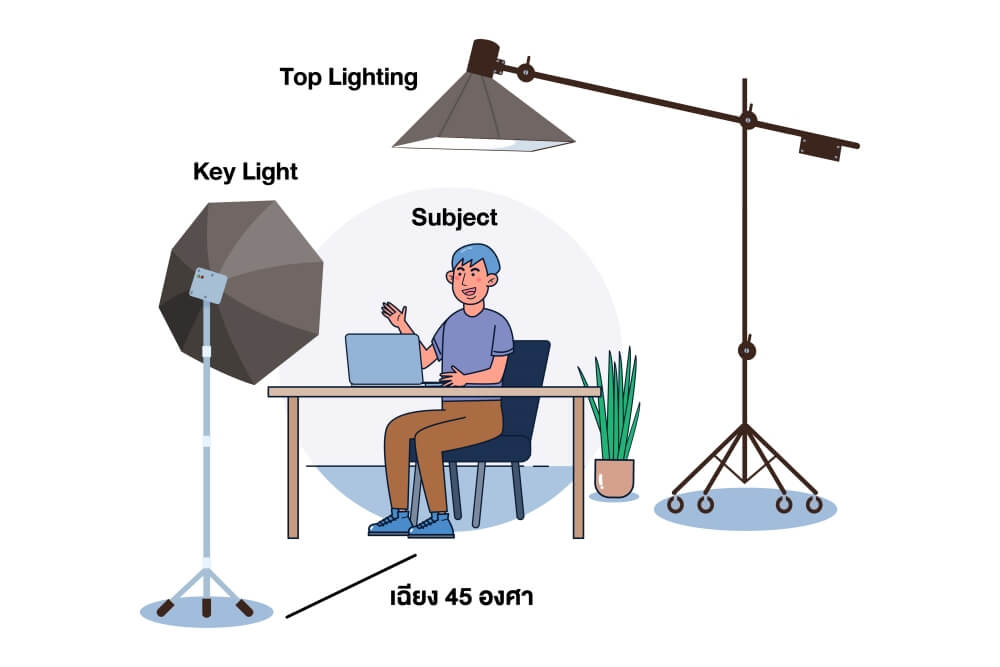 อีก 1 ไฟที่อยากแนะนำให้จัดด้วยก็คือ ไฟด้านบน หรือไฟมุมท็อป (Top Lighting) เป็นทิศทางของแสงจากด้านบนของตัวแบบ เพราะถ้าจัดแต่ไฟหลัก (Key Light) จะทำให้ส่วนหัวด้านบนมืด ดูแล้วไม่สบายตา และยิ่งเป็นสายรีวิวแล้ว การที่จัดไฟมุมท็อป จะทำให้ไฟส่องมาที่สินค้าโดยตรง และจะทำให้เห็นรายละเอียดสินค้าอย่างชัดเจน