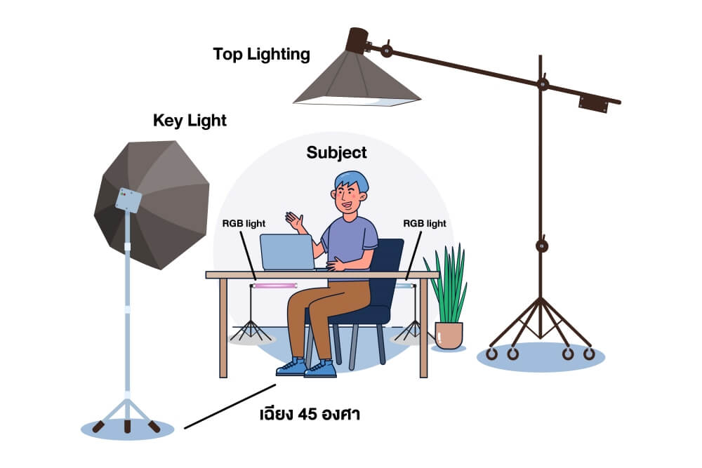 และการเลือกใช้ไฟหลัก (Key Light) ควรเป็นไฟที่ให้กำลังไฟสูง พร้อมมี Softbox และ Grid เพื่อลดการรั่วไหลของแสง ช่วยควบคุมทิศทางของแสงให้กระชับขึ้น และไม่ทำให้ไฟฉากหลังที่เราจะเปิด เพื่อสร้างมู้ดให้วิดีโอไม่ดรอปลงด้วย
