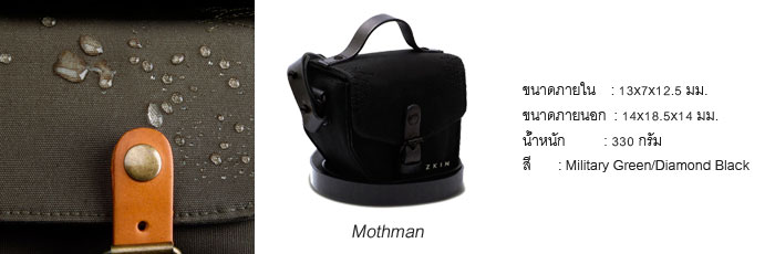 Mothman เป็นกระเป๋าที่มีรูปทรงเป็นเอกลักษณ์ด้วยการตัดเฉียงมุมลาดในส่วนล่างของกระเป๋าเพื่อให้ดูเล็ก กะทัดรัด และออกแบบให้ภายในสามารถหยิบกล้องได้ง่ายไม่ต้องไปควานหยิบกล้องจากก้นกระเป๋า ลักษณะการเก็บจึงกึ่งบังคับให้วางกล้องไว้แนวตั้งสะดวกต่อการหยิบใช้งาน เลือกใช้วัสดุแบบ Water Splash Proof Canvas/Leather มี 2 สี ให้เลือก ได้แก่ Military Green และ Diamond Black