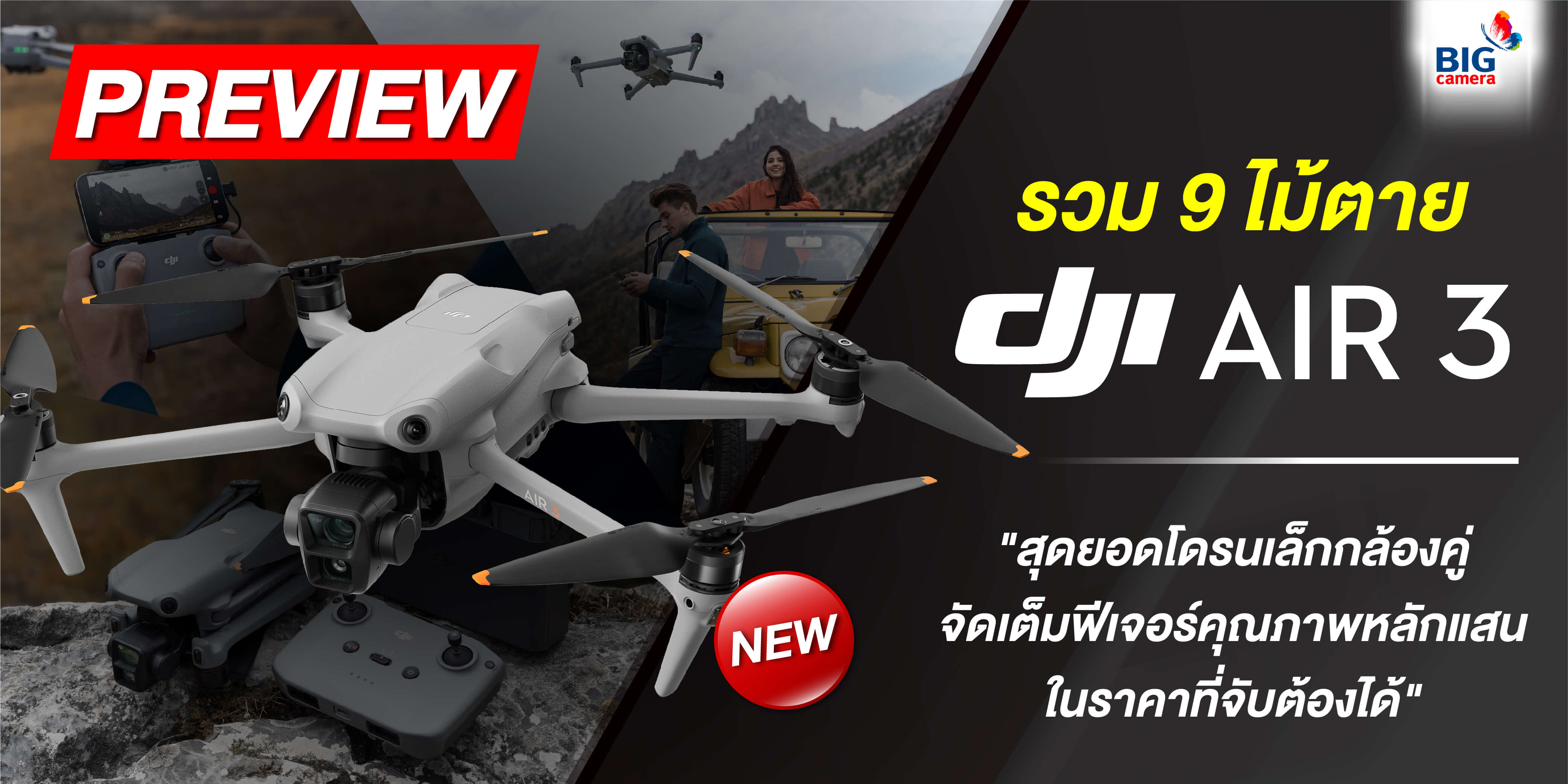 สวัสดีครับ กลับมาเจอกันอีกแล้ว วันนี้พวกเราชาว BIG Camera จะพาไปดูความสามารถของโดรนใหม่ที่เพิ่งเปิดตัวไปหมาด ๆ กันครับ ใช่ครับ ทายไม่ผิดหรอก โดรนเล็กกล้องคู่ DJI Air 3 นั่นเองครับ ไปครับ ไปดูกันเลยดีกว่า ว่าโดรนเล็กกล้องคู่ตัวนี้มันมีอะไรเจ๋ง ๆ รอเราอยู่กันบ้าง