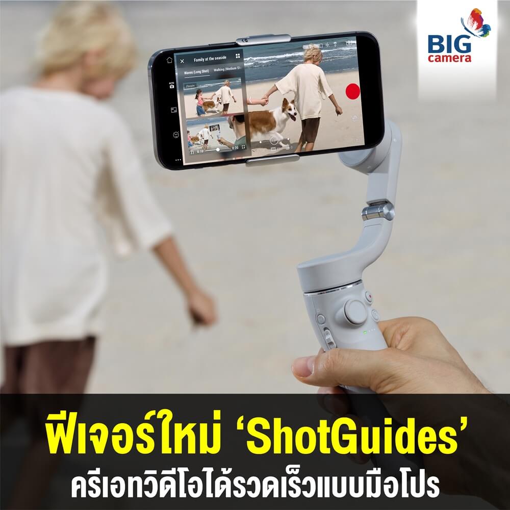 ตัวช่วยมือใหม่ให้สร้างสรรค์คลิปได้แบบมือโปร ด้วยฟีเจอร์ใหม่ที่เพิ่มเข้ามาใน DJI OM 5 นั่นก็คือ 'ShotGuides' เป็นฟังก์ชั่นที่ช่วยตรวจสอบสภาพแวดล้อมโดยอัตโนมัติ และแนะนำเทคนิคการถ่ายให้เหมาะกับสภาพแวดล้อมนั้น ๆ รวมถึงมีเทมแพลตวิดีโอให้เลือกใช้ ไม่ว่าจะเป็นการถ่ายคน สัตว์เลี้ยง ทิวทัศน์ พร้อมตัดต่อ และแชร์ลงโซเชียลได้เลย