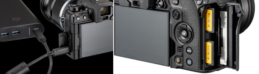 ด้านข้างมีช่องเสียบสาย USB รองรับการชาร์จผ่านตัวกล้องโดยตรง หรือใครที่ไปเที่ยวและไม่อยากพกแบตไปหลายก้อน รุ่นนี้ก็รองรับการชาร์จผ่าน Power bank แบบ PD ส่วนช่องเสียบการ์ดรุ่นนี้ก็มีมาให้ทั้งหมด 2 ช่อง ถ่ายภาพเยอะแค่ไหนก็ไม่ต้องกลัวเมมเต็ม