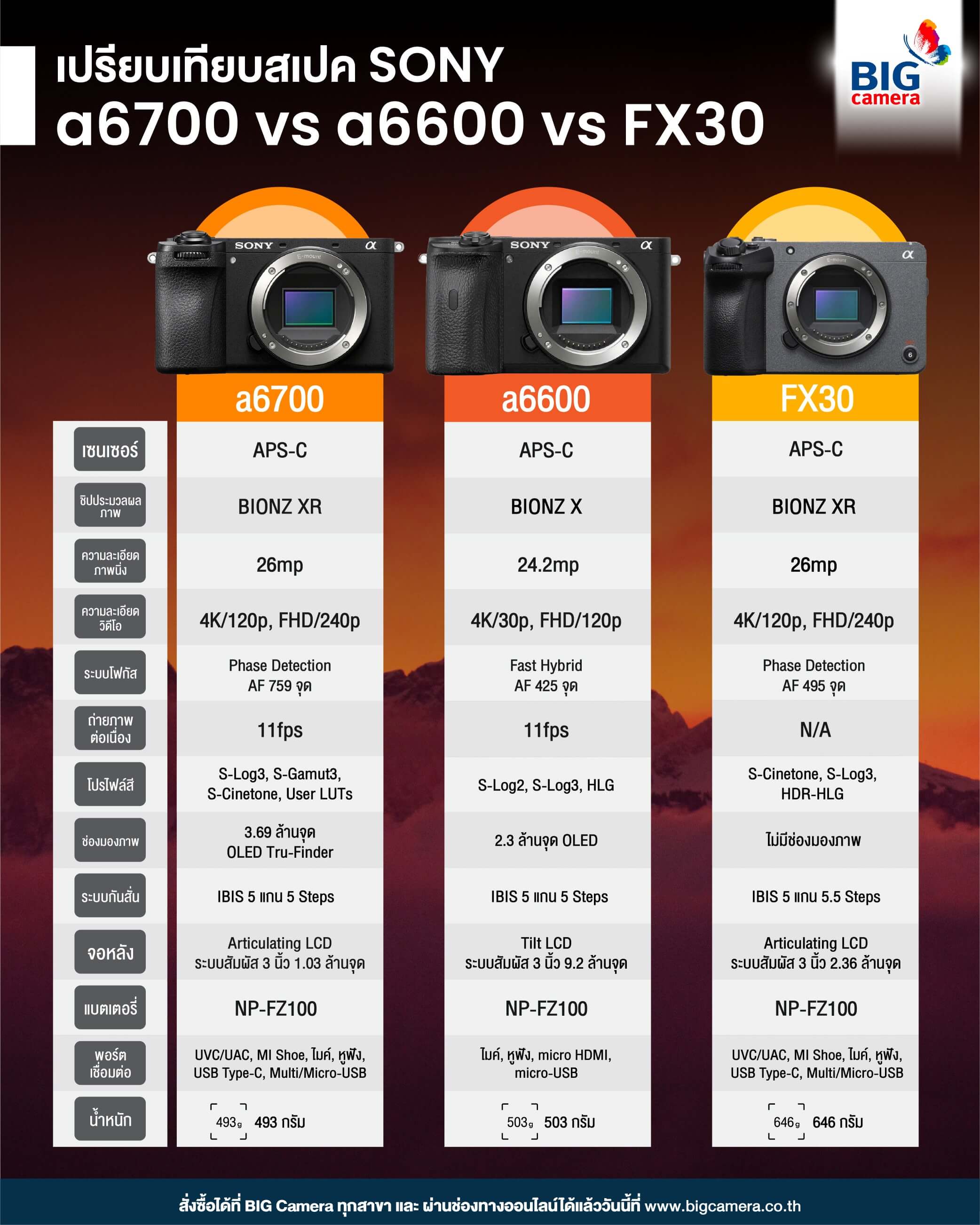 เปรียบเทียบสเปค Sony a6700 vs a6600 vs FX30 กล้อง Mirrorless Hybrid เซ็นเซอร์ APS-C ระดับไฮเอนด์รุ่นใหม่ล่าสุด ที่เพิ่งเปิดตัวมาหมาดๆ ใครกำลังลังเลว่าจะถอยรุ่นไหนดี วันนี้ที่ BIG Camera มีคำตอบมาให้แล้วครับ