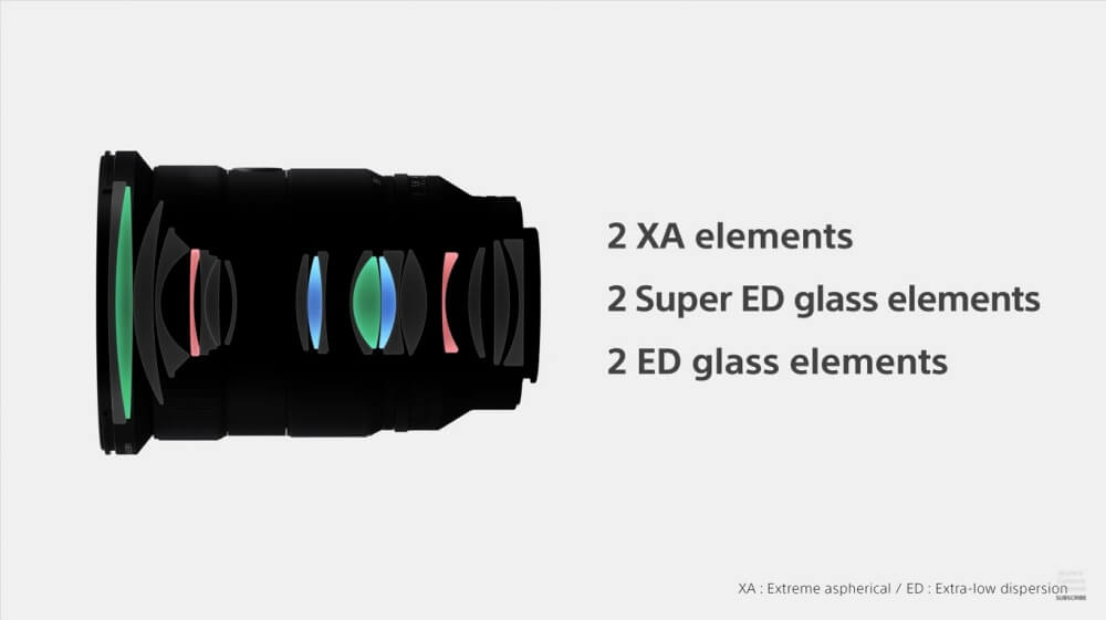 โครงสร้างชิ้นเลนส์ 20 ชิ้น แบ่งเป็น 15 กลุ่ม (ชิ้นเลนส์พิเศษ Aspherical 3 ชิ้น, Extreme Aspherical 2 ชิ้น, ED 2 ชิ้น, Super ED 2 ชิ้น)