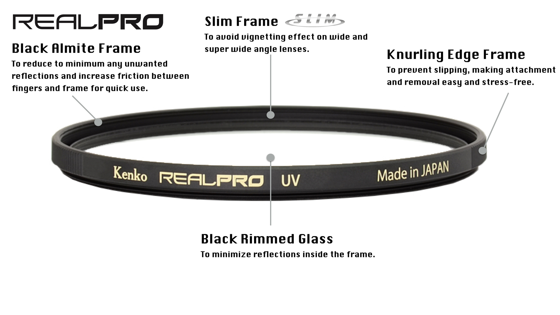 FRAME...โครงสร้างอลูมิเนียมอัลลอยด์(Aluminium Alloy)มีความแข็งแรง น้ำหนักเบา มีเกลียวทั้งด้านบน และด้านล่าง ผ่านการเคลือบผิวสีดำด้านทั้งตัว มีการเซาะร่องแนวขวางในตำแหน่งที่นิ้วมือจะจับเพื่อหมุนเกลียวเข้ากับเลนส์ป้องกันการลื่นจับไม่ถนัด เนื่องจากฟิลเตอร์รุ่นRealproมีขอบบางมาก(Slim Frame)รองรับการใช้ร่วมกับเลนส์มุมกว้างพิเศษเพื่อไม่ให้เกิดเงาดำตามมุมภาพ โดดเด่นด้วยตัวอักษรสีทอง ที่จะระบุข้อมูลชื่อแบรนด์ ประเภทของฟิลเตอร์ แหล่งผลิต และขนาดหน้าเลนส์ สร้างความเชื่อมั่นในมาตรฐานการผลิตชั้นสูง ผลิตมาหลายขนาดตั้งแต่ 37-105มม. ระดับราคาก็ใกล้เคียงกันง่ายต่อการตัดสินใจเป็นเจ้าของ