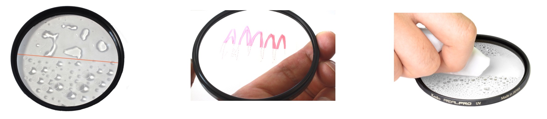 ANTI-STAIN COATING เทคโนโลยีการเคลือบผิวหน้าชิ้นแก้วชั้นสูงป้องกันละอองน้ำ ฝุ่นมาเกาะด้านหน้าช่วยให้สามารถเช็ดหรือเป่าออกไปได้ง่ายไม่ยึดเกาะที่พื้นผิวเปรียบเสมือนคราบน้ำมันที่ลอยตัวบนผิวน้ำ มีการทดสอบแบบโหดๆเพื่อให้เห็นภาพชัดเจน นั่นคือการนำปากกาเคมีที่เรียกว่า Papernant เขียนจะไม่ติดลงไปในเนื้อแก้ว แต่จะเขียนหมึกจะกลายเป็นหยดน้ำเวลาเช็ดก็ใช้กระดาษเช็ดเลนส์ซับเพียงเบาๆฟิลเตอร์ก็กลับมาใสเหมือนใหม่แล้ว นอกจากนั้นแต่ละชั้นยังมีเทคโนโลยีการป้องกันแสงสะท้อนช่วยให้แสงผ่านเข้าสู่เซ็นเซอร์ได้ชนิดที่เรียกว่าเสียน้อยมากๆเหมือนไม่เสีย เพื่อให้คุณมั่นใจว่าจะไม่ทำให้เลนส์เกรดโปรของคุณถูกลดทอนคุณภาพ แต่กลับเป็นช่วยถนอมอายุการใช้งานและลดความเสี่ยงที่ไม่จำเป็นออกไปกับสภาพมลภาวะในอากาศที่มากขึ้น