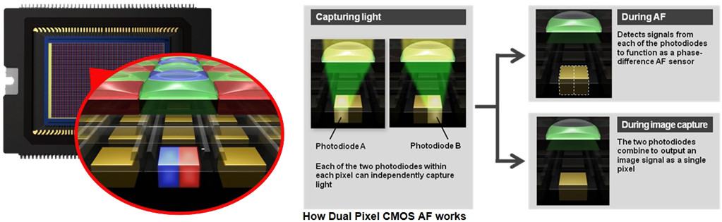 | Image Sensor จะประกอบไปด้วยPhotodiodeจำนวน 40.3 ล้านตัว ทำให้ Phase-difference detection AF ทำงานได้อย่างรวดเร็ว ในแต่ละพิกเซลจะมีไดโอด2ตัว แบ่งเป็นdiode A และ diode B แต่ละตัวจะทำหน้าที่รับสัญญานแสงแยกเป็นอิสระต่อกัน ช่วงที่ระบบโฟกัสอัตโนมัติทำงาน Photodiode จะคอยหาระยะโฟกัสภาพ เมื่อจะทำการบันทึกภาพสัญญานจากทั้งคู่จะถูกนำมารวมกันเป็นข้อมูลภาพในแต่ละพิกเซล มีพื้นที่การทำงานครอบคลุมกว่า80%ทั้งแนวตั้ง และแนวนอน โดยระหว่างโฟกัสภาพสัญญานค่าความแตกต่างของบริเวณจุดโฟกัสจะถูกนำมาประมวลผลเพื่อปรับระยะโฟกัสของเลนส์ ซึ่งระบบนี้จะแตกต่างจากการหาระยะชัดของ Contrast AF เนื่องจากมันสามารถคำนวณทิศทางการเคลื่อนที่ และตำแหน่งโฟกัสได้อย่างถูกต้อง รวดเร็วไม่เหมือนการหาโฟกัสแบบ Hybrid AF เทคโนโลยีนี้จึงทำให้ความเร็วในการสนองโฟกัสใน One-Shot AF และ Movie Servo AF ทำงานได้ดียิ่งขึ้น |
