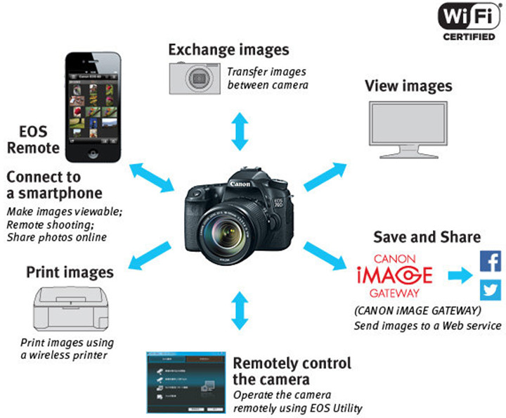| EOS 70D ก้าวล้ำนำสมัยคู่ไปกับกล้องรุ่นพี่ EOS 6D ด้วยการติดตั้ง Built-in Wi-Fi ระบบสัญญานเชื่อมต่อข้อมูลไร้สายให้ในตัวที่ช่วยทั้งการควบคุมตัวกล้อง หามุมมองการถ่ายภาพในมุมแปลกกว่าที่เคย ส่งภาพต่อเข้าคอมพิวเตอร์ ส่งเข้าสู่สังคมออนไลน์ หรือสั่งพิมพ์ลงกระดาษเพื่อแสดงผลงานตามแกลอรี่ โดยอาศัยแอพลิเคชั่น EOS Remote app โหลดมาเก็บไว้ในอุปกรณ์สมาร์ทดีไวซ์ อาทิ สมาร์ทโฟน แท๊บเล๊ต จากนั้นก็สั่งเชื่อมต่อสัญญานไม่ว่าจะเป็น Android หรือ iOS ก็รองรับการใช้งานได้ ซึ่งแอพลิเคชั่นที่ว่านี้ควบคุมการเลือกจุดโฟกัส การตั้งค่ารูรับแสง ค่าความเร็วชัตเตอร์ ค่าความไวแสง ก่อนการกดชัตเตอร์บันทึกภาพจะเริ่มทำงาน ซึ่งตอนนี้ยังคงใช้กับการบันทึกภาพนิ่งเท่านั้นยังไม่สามารถใช้กับภาพวิดีโอได้เพราะต้องอาศัยพื้นที่ และการประมวลผลมากกว่าปกติ |