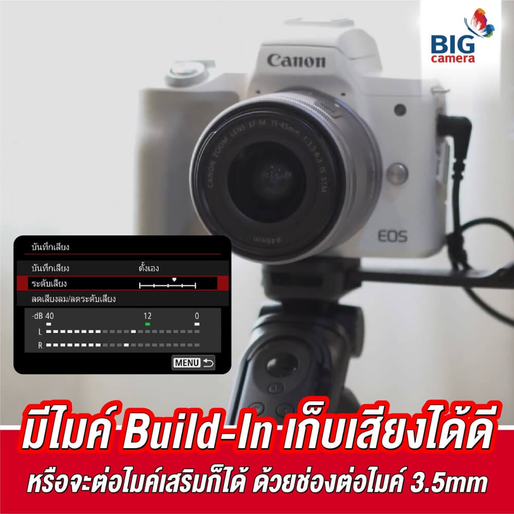 ในเรื่องของคุณภาพเสียง กล้อง Canon EOS M50 Mark II ก็ทำได้ดีไม่แพ้ใครเลย เพราะตัวนี้เขามีระบบลดเสียงรบกวนอย่างเสียงลม โดยเราสามารถตั้งค่าเองจากในกล้องได้เลย เหมาะกับสาย Content Creator หรือ Vlog ที่ชอบถ่ายงาน Outdoor หรือถ้าอยากได้คุณภาพเสียงที่ดีกว่าเดิมก็สามารถต่อไมค์นอกได้ เพราะกล้องรุ่นนี้เขามีช่องต่อไมค์แบบ 3.5mm ให้มาด้วย
