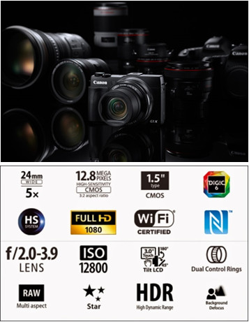 | Canon PowerShot G1 X Mark II กล้องเล็กที่จับเอาเซ็นเซอร์ CMOS ขนาดใหญ่ 1.5 นิ้วมาเป็นหัวใจสำคัญในการสร้างสรรค์ภาพด้วยความละเอียด 12.8 ล้านพิกเซลเมื่อใช้สัดส่วนภาพ 3:2 และ 13.1 ล้านพิกเซลเมื่อตั้งสัดส่วนภาพเป็น 4:3 ใช้ระบบประมวลผลรุ่นใหม่ DIGIC6 ที่ทำงานรวดเร็วมีความชาญฉลาดในการแสดงรายละเอียดแม้ปรับใช้ในที่แสงน้อยด้วยความไวแสงสูงขณะบันทึกภาพนับว่าเป็นทางเลือกที่เหมาะสำหรับท่านที่มองหากล้องคอมแพคสเปคสูงอยากนำพกติดตัวไปด้วยในกระเป๋า |
