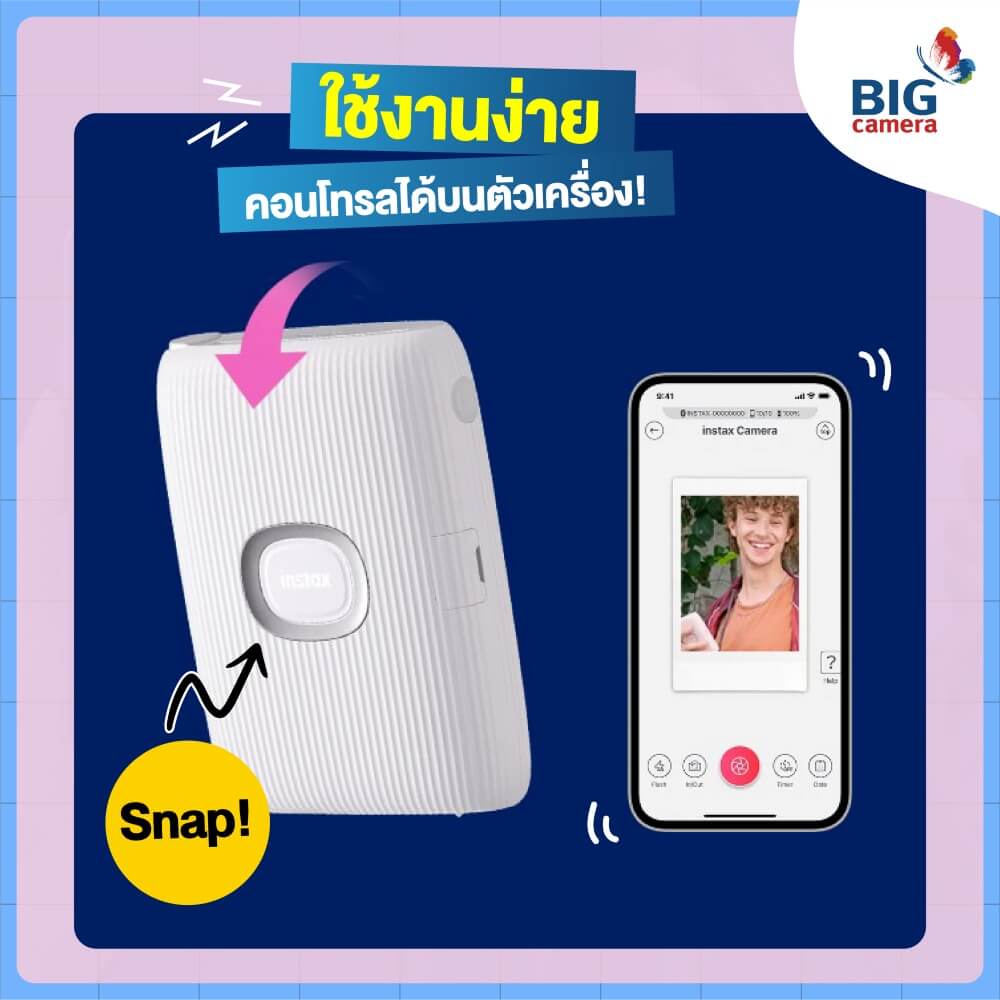 อีก 1 อย่าง ที่ทำให้เราสนุก และใช้งานได้สะดวกคือ การคอนโทรลง่าย ๆ บนตัวเครื่อง เพราะจะสามารถกดถ่ายด้วยปุ่มเดียว + ซูมเข้า-ออกแค่ขยับเครื่อง! หลังจากลิงค์ผ่านแอปฯ instaxAiR แล้ว เราจะคอนโทรลผ่านตัวเครื่องปริ้นท์ได้ จะกดชัตเตอร์ถ่าย ก็กดปุ่มตรงกลางด้านเครื่องได้เลย หรือจะเฟรม ซูมภาพเข้า-ออก ก็แค่โยกเครื่องไปด้านหน้า = ซูมเข้า ,โยกไปด้านหลัง = ซูมออก บอกเลยว่าใช้งานได้สะดวกจริง!