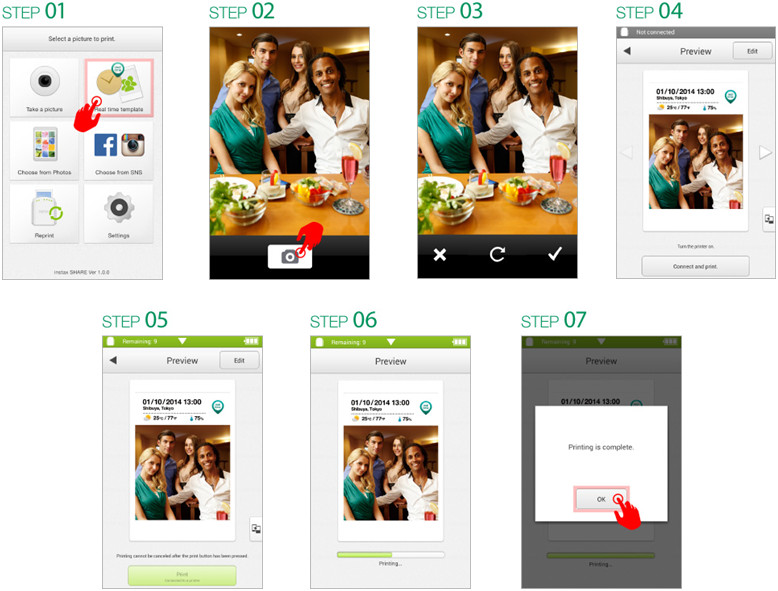 instax SHARE พร้อมพิมพ์ภาพเมื่อกดปุ่มPowerค้างไว้ประมาณ 1 วินาที ถ้าต้องการเลือกภาพจากสมาร์ทโฟนก็เปิดแอพพลิเคชั่น instax SHARE เลือกภาพจากสื่อต่างๆ อาทิ Gallery, Facebook, Instagram แล้วเลือกเชื่อมต่อเครื่องพิมพ์ (Connect and print) สังเกตรหัสเครื่องให้ตรงกันแล้วใส่รหัสผ่านกดยืนยัน จากนั้นกดสั่งพิมพ์ภาพที่ต้องการเพียง16วินาทีคุณก็ได้ภาพมาอยู่ในมือ (ไม่ต้องสะบัดหรือเป่าเพียงวางไว้ภาพก็จะค่อยๆปรากฎขึ้นมาเอง) หากสั่งพิมพ์ภาพจากกล้อง Fujifilm ตอนนี้เชื่อมต่อได้ครอบคลุม 3 รุ่นคือ XQ1, X-A1 และ X-M1 นับว่าเป็นความพิเศษจากแบรนด์นี้จริงๆที่ทำให้นักถ่ายภาพสามารถพกพาเครื่องพิมพ์ภาพขนาดมินิไปด้วยทุกที่เพื่อพิมพ์ภาพแจกกันแบบสดๆไม่ต้องรอกลับไปที่บ้าน หรือที่พัก จะอยู่บนยอดเขา หรือในทะเลก็ไม่เป็นอุปสรรคขอเพียงให้อุปกรณ์กับเครื่องพิมพ์เชื่อมต่อกันได้ก็สร้างงานได้ กรณีอยากได้ภาพเดิมหลายๆใบสามารถสั่งพิมพ์ซ้ำได้ไม่จำกัดจากหน่วยความจำในเครื่องแม้จะปิดเครื่องไปแล้วก็ตาม หากต้องการยกเลิกความจำล่าสุดออกไปเพียงกดปุ่ม REPRINTค้างไว้ประมาณ 5 วินาทีจะมีไฟแสดงสถานะกะพริบก็เป็นอันล้างข้อมูลเก่าเสร็จสิ้นไม่ต้องเกรงจะมีใครแอบมาprintภาพของเราโดยไม่รู้ตัว อ้อ!ลืมไปลูกเล่นของการสั่งจากสมาร์ทโฟนจะมีฟังก์ชั่นการเลือก Template, Filter และ Edit ภาพ นอกจากนั้นสามารถใส่ข้อมูลภาพ ตัวหนังสือคำบรรยายใต้ภาพได้ใครที่เคยเล่นตกแต่งภาพน่าจะคุ้นเคยเป็นอย่างดีอยู่แล้ว สำหรับภาพจาก Facebook จะมีรูป Profile และแหล่งที่มา รวมถึงวันที่โพลต์ระบุอยู่ที่ส่วนบนของภาพ ถ้าเป็นสั่งพิมพ์ Real time template จะมีระบุอุณหภูมิ