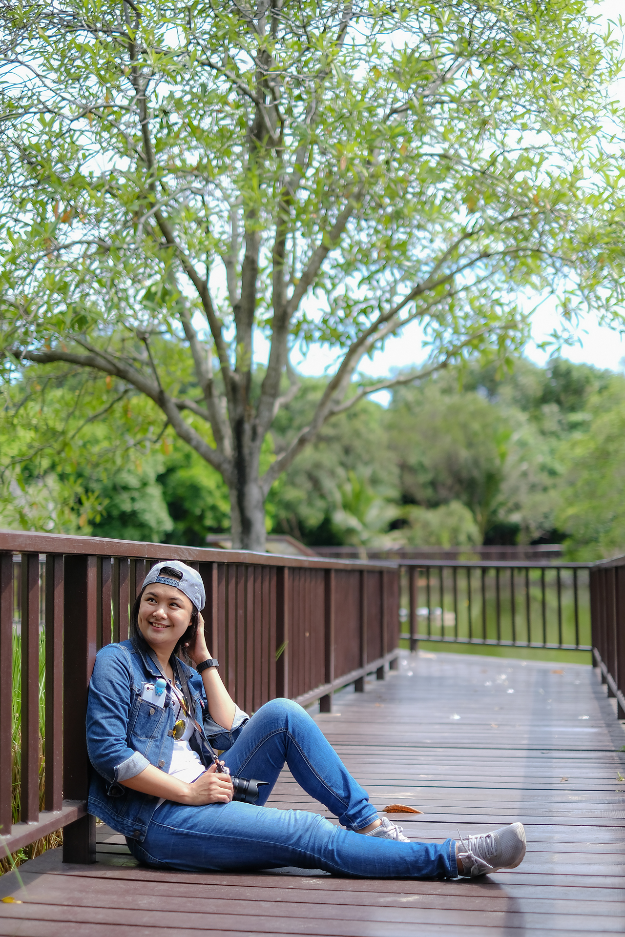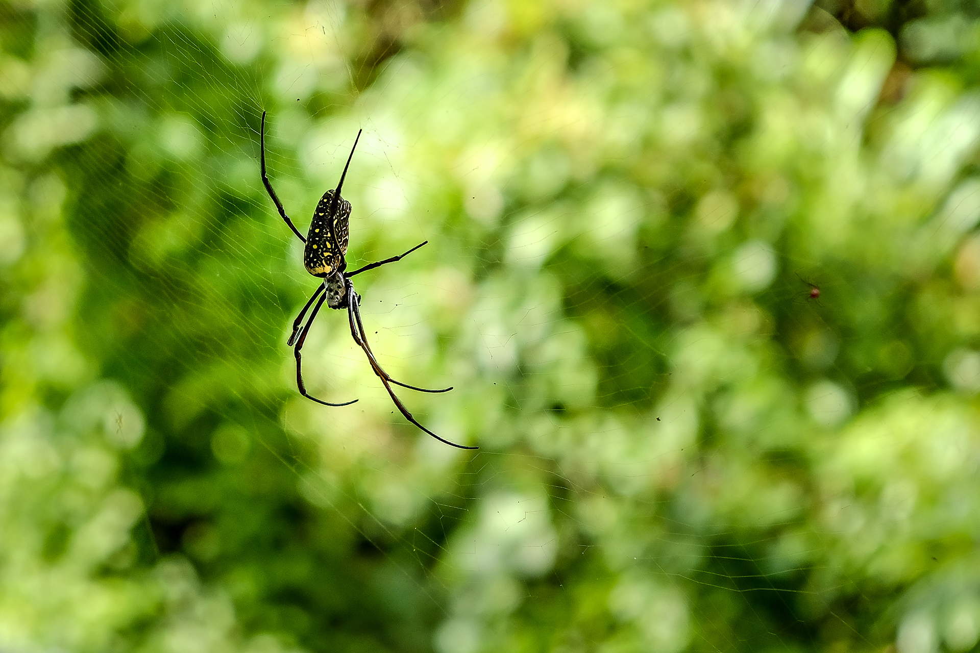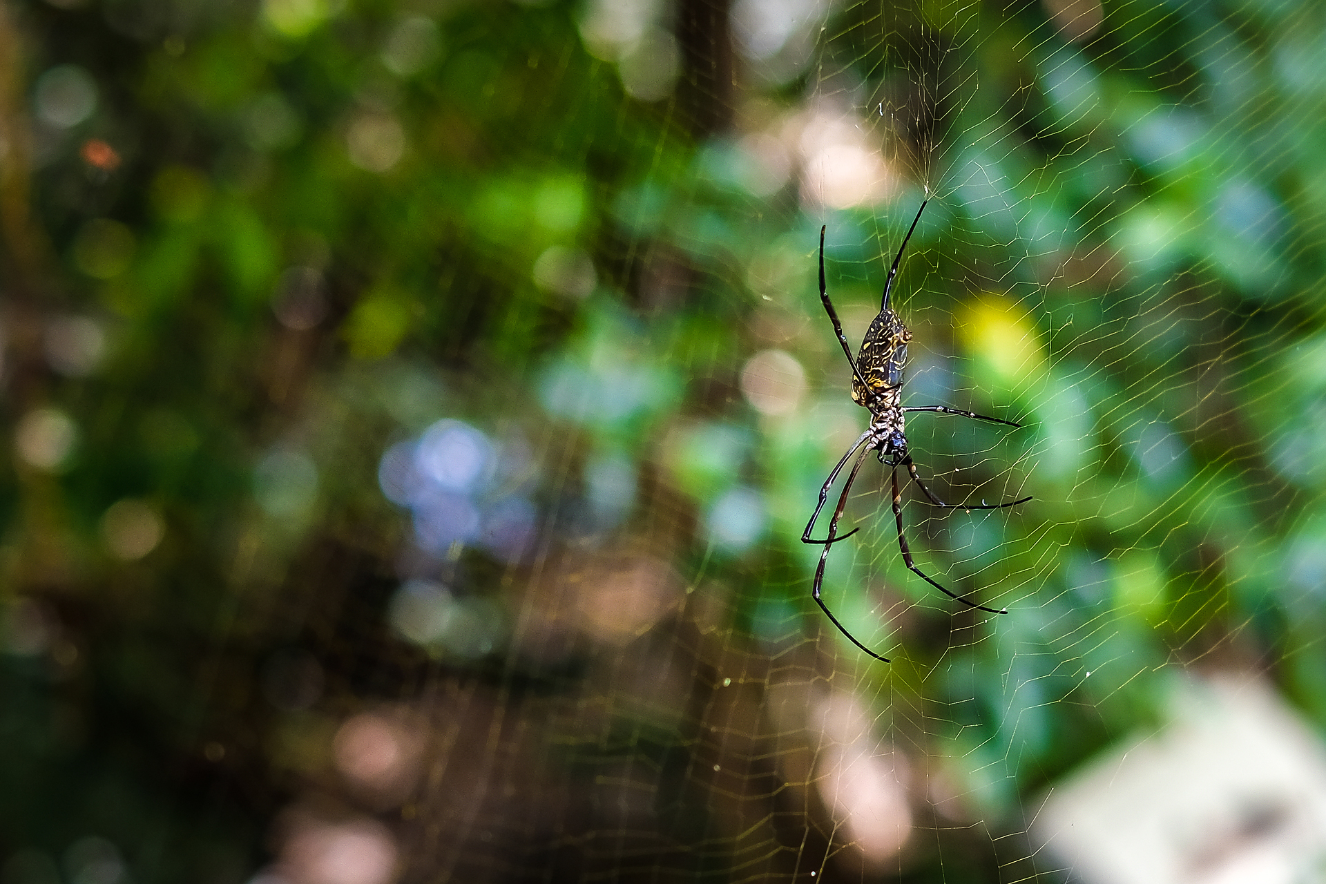 ปั่นจักรยานเล่นสักพักก็ถึงจุดที่เป็น Landmark ของที่นี่นั้นก็คือหอดูนกนั้นเอง พอขึ้นไปด้านบนก็เจอเจ้าแมงมุมไหมทองตัวใหญ่มากสีสวยด้วย ยืนทำใจอยู่นานกว่าจะได้รวบรวมความกล้าเดินเข้าไปถ่ายใกล้ๆ โดยปกติถ้าถ่ายภาพแบบนี้มักจะโฟกัสเข้ายาก แต่ X-E3 โฟกัสได้อย่างง่ายดายแม้จะมีแสงสะท้อนจากในไม้ข้างหลังก็ยังโฟกัสได้อย่างแม่นยำ