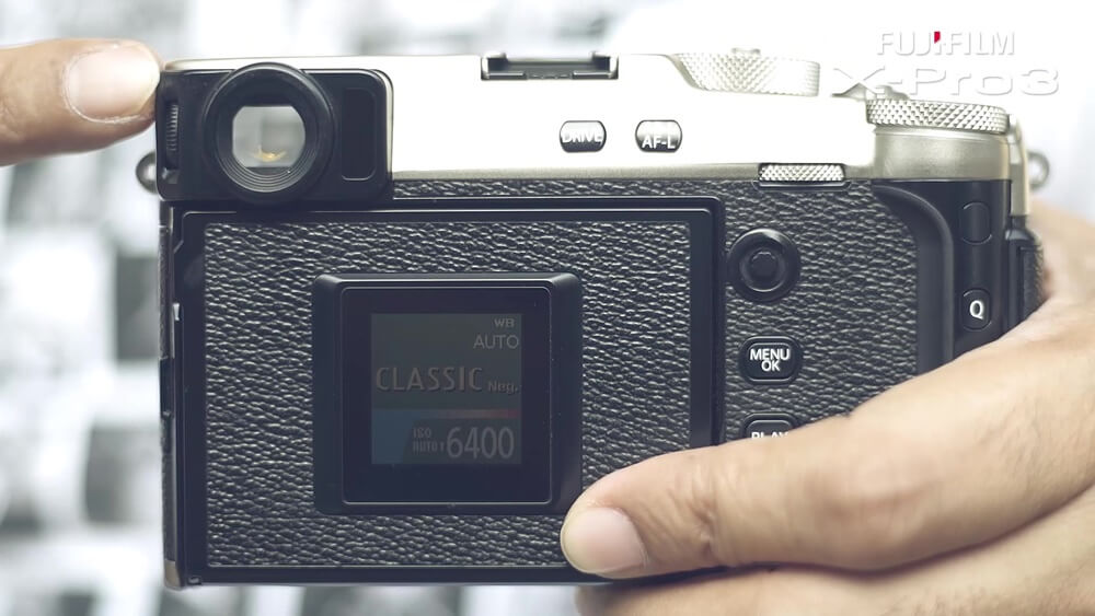 ในส่วนของหน้าจอ LCD นี้เป็นแบบทัชสกรีนมีขนาด 3 นิ้ว ด้วยความละเอียด 1.62 ล้านจุด ซึ่งกล้องรุ่น X-Pro 3 นี้จะถูกซ่อนตัวอยู่ด้านใน สามารถพับลงมา (tilt-down) ได้ เพื่อให้เราโฟกัสสิ่งที่กำลังจะถ่ายมากกว่าการดูรูปภาพและให้ความรู้สึกเหมือนได้กลับไปใช้กล้องฟิล์มที่เน้นการใช้งานผ่านช่องมองภาพเป็นหลัก และด้านหน้ายังมี Sub LCD ที่เอาไว้แสดงการตั้งค่าสี Film Simulation ที่เปรียบเสมือนกลักฟิล์มสีต่าง ๆ