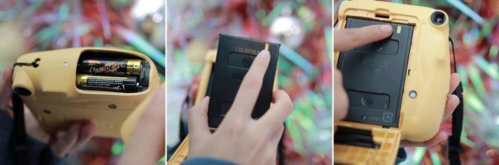 เริ่มแรกก็ให้ใส่แบตเข้าไปที่ตัวกล้อง จากนั้นแกะฟิล์ม instax พร้อมเปิดฝาหลังกล้อง และวางให้แถบสีเหลืองตรงกันแบบนี้!