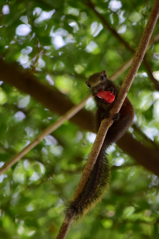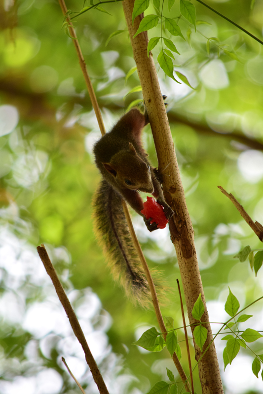 | Nikon D3300 สามารถใช้ได้กับเลนส์ทุกรุ่นที่เป็นรหัส DX และ FX จึงไม่ได้จำกัดว่าจะเป็นนักถ่ายภาพตั้งแต่ยุคฟิล์ม หรือไม่เคยใช้กล้องดิจิตอลที่จะนำไปใช้งานท่านที่มีเลนส์เก่าก็เอามาใส่ได้ หรืออยากลงมาเล่นเซ็นเซอร์เล็กบ้างเพราะต้องการอาศัยช่วงเทเลโฟโต้จากการคูณ 1.5 xจากช่วงทางยาวโฟกัสเดิม สำหรับการทดสอบครั้งนี้ได้เลนส์หลายช่วงมาใช้แต่ที่ชอบและติดใจคงต้องยกให้ AF-S DX Nikkor 55-300 mm f/4.5-5.6G ED VR ที่ช่วยบันทึกภาพวัตถุที่อยู่ไกลให้ถูกดึงเข้ามาไว้ในเฟรมเห็นชัดเจนใกล้ๆ สามารถเก็บภาพกระรอกในธรรมชาติที่วิ่ง กระโดดไปมาได้อย่างคมชัด รวดเร็ว ให้ฉากหลังที่ละลายสวยงาม ลองซูมขยายดูก็ต้องทึ่งกับระบบลดความสั่นไหวที่ทำได้ดีแม้จะใช้ความเร็วชัตเตอร์ต่ำกับสภาพแสงน้อย ระบบโฟกัสอัตโนมัติแบบติดตามวัตถุเป็นระบบที่เลือกใช้เพราะวัตถุมีการเคลื่อนที่แทบจะตลอดเวลา หลังจากถ่ายภาพเสร็จก็โหลดภาพดูผ่านคอมพิวเตอร์ขยายมาดูใกล้ๆ รอยยิ้มที่มุมปากเผยอออกตลอดเวลาเช่นกันเพราะได้จังหวะภาพดีๆ ในอิริยาบทของกระรอกหลายภาพ ซึ่งสีสันและรายละเอียดถ่ายทอดได้สมราคาจริงๆ |
