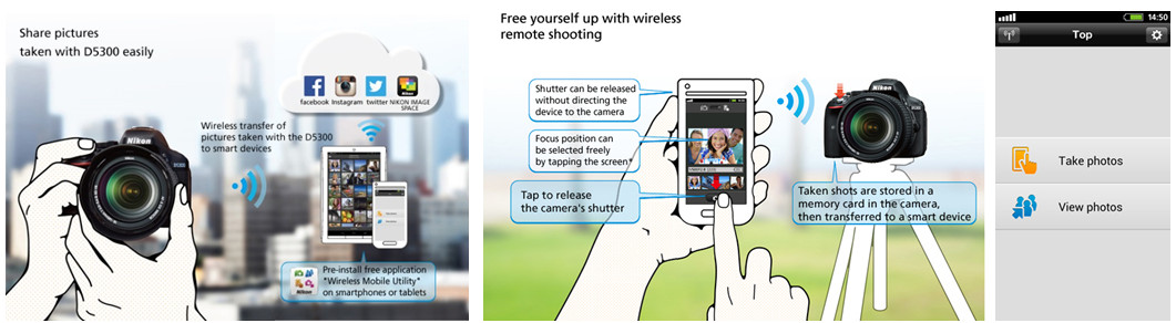 | Nikon D5300 แชร์ภาพได้ทุกเวลาด้วย Wi-Fi ในตัวทำให้เชื่อมต่อกับอุปกรณ์ Smart Device ทั้งหลายได้ง่ายดายและรวดเร็วเพียงดาวน์โหลดแอพพลิเคชั่น Wireless Mobile Utility มาใช้สิ่งที่คุณต้องการก็มีเพียงกล้องและอุปกรณ์อัจฉริยะของคุณเท่านั้น เพียงเลือกรูปที่ต้องการ รูปเหล่านั้นก็จะพร้อมส่งไปยังสมาร์ทโฟนหรือแท็บเล็ตของคุณได้ทันที นอกจากนี้คุณยังสามารถโอนย้ายรูปถ่ายแบบไร้สายโดยที่ไม่ขัดจังหวะการถ่ายภาพของคุณ และไม่จำเป็นต้องมีทักษะด้านคอมพิวเตอร์ใดๆ ทั้งสิ้น ตอนนี้คุณสามารถแชร์รูปถ่ายบน Facebook, Instagram, Twitter และไซต์เครือข่ายสังคมออนไลน์อื่นๆ ได้ และด้วยรูปถ่ายที่ถ่ายด้วยกล้อง D5300 รูปของคุณจะดึงดูดสายตาและการกด "ไลค์" จากเพื่อนๆ ได้ทันที ความพิเศษการเชื่อมต่อ Wi-Fi® ไม่ได้มีแต่เอาไว้ดูภาพเท่านั้น แต่ยังช่วยให้คุณถ่ายภาพได้ด้วยฟังก์ชั่นการถ่ายภาพระยะไกล ที่ช่วยให้สามารถกดชัตเตอร์ได้จากตำแหน่งห่างไกล ในขณะที่คุณสามารถใช้อุปกรณ์อัจฉริยะเป็นจอภาพไลฟ์วิวแบบระยะไกล เพื่อยืนยันภาพถ่ายเหมาะอย่างยิ่งสำหรับการถ่ายภาพหมู่ ตัวกล้องยังสามารถสร้างบันทึกการติดตามข้อมูลตำแหน่งที่ตั้งได้ (GPS) หน่วยข้อมูลตำแหน่งที่ตั้งของกล้องจะบันทึกข้อมูลละติจูด ลองติจูด ระดับความสูง และเวลาลงในการ์ด SD (ระยะเวลาที่มีให้เลือก: 6 ชม., 12 ชม., 24 ชม.; ช่วงเวลาที่มีให้เลือก: 15 วินาที, 30 วินาที, 60 วินาที) ฟังก์ชั่นนี้จะทำงานแม้จะปิดกล้องอยู่ ข้อมูลตำแหน่งที่ตั้งทั้งหมดนี้จะถูกนำเข้าไปยัง ViewNX 2 และมุมมองแผนที่บน NIKON IMAGE SPACE : บริการจัดเก็บและแชร์ภาพถ่ายของ Nikon ผู้ใช้จะได้รับพื้นที่จัดเก็บข้อมูลสูงสุดถึง 20 GB โดยไม่เสียค่าใช้จ่าย...ยอดเยี่ยมมากๆ |