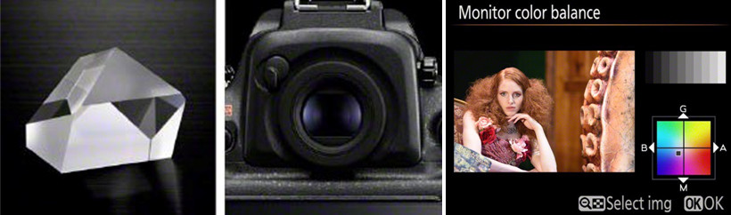| D810 ใช้ช่องมองภาพออพติคัลที่เลือกนำปรึซึมแก้วขนาดใหญ่ให้ภาพสว่างใส คมชัด เห็นภาพ 100% ให้อัตราขยาย 0.7 เท่า มีการแสดงผลข้อมูลในช่องมองแบบ Organic EL ด้านใต้ให้ข้อมูลคอนทราสต์สูง และสดใสแต่ใช้พลังงานน้อย มั่นใจได้ถึงการบันทึกภาพกลางแจ้งที่สวยโดดเด่น แม้จะมีแสงสว่างจ้าจากด้านหลังรบกวน สำหรับจอภาพ LCD ด้านหลังใช้ขนาด 3.2 นิ้ว/8 ซม. ความละเอียดประมาณ 1,229,000 จุด ใช้การปรับ RGBW เพื่อความสว่างที่มากขึ้น คุณสมบัติข้างต้นเป็นการผสานกับโครงสร้างของกระจกและแผงเป็นหนึ่งเดียวกันช่วยเพิ่มประสิทธิภาพการมองเห็นสภาพแสงในเวลากลางวันและขยายตัวช่วงการปรับปรุงคุณภาพสีที่กว้างยิ่งขึ้น พื้นผิวจอภาพยังทำจากกระจกกันรอยขีดข่วนและกันกระแทก ซึ่งในกล้องรุ่นใหม่ๆของนิคอนจะเลือกใช้เทคโนโลยีนี้ |