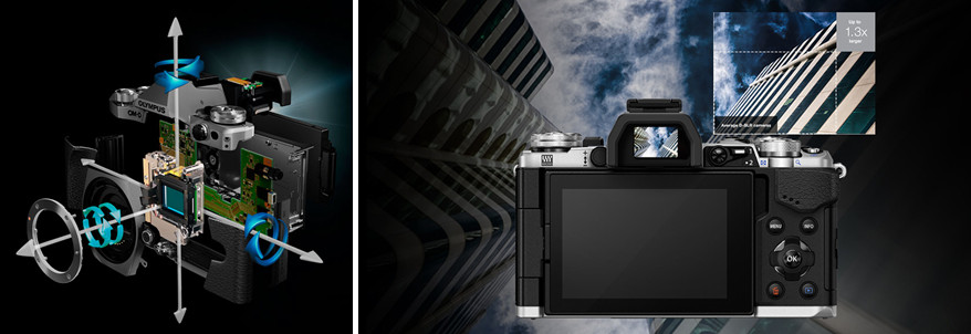 OM-D E-M5 Mark II ประกาศความโดดเด่นในเรื่องของระบบกันสั่นไหว VCM แบบ 5 แกน(5-axis image stabilization) ชดเชยแสงได้เทียบเท่าความเร็วชัตเตอร์ถึงห้าสตอป เป็นกล้องที่มีกะโหลกหน้าตาเหมือน SLR ตัวแรกของโลกที่ใส่คุณสมบัตินี้เข้าไปให้ภาพมีความคมชัดสูงแม้ในสถานการณ์ที่ยากลำบาก ซึ่งมันพร้อมจะลุยไปด้วยทุกที่สนองความต้องการแม้จะมีฝุ่นหรือละอองน้ำมาเป็นอุปสรรค การทำงานของระบบนี้จะรองรับทั้งการถ่ายภาพนิ่ง และภาพวิดีโอเคลื่อนไหวได้อย่างเยี่ยมยอด โดยเฉพาะความเมื่อยล้าจากการใช้งานเป็นเวลานานของกล้องตัวใหญ่ๆ จะลดลงอย่างมากเรียกว่าโอลิมปัสเน้นการถือถ่ายด้วยมือเปล่าไม่ต้องติดอุปกรณ์เสริมช่วยใดๆ ให้เกะกะ