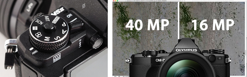 OM-D E-M5 Mark II มีความสามารถพิเศษในการทำให้คุณภาพของภาพเหนือชั้นกว่ากล้องแบบฟลูเฟรมทั่วไปด้วยโหมด 40M High Res. Shot โดยกล้องจะบันทึกภาพ 8 ภาพ ในระดับความคมชัด 16 ล้านพิกเซล แล้วเลื่อนเซ็นเซอร์ครั้งละ 0.5 พิกเซลต่อสเต็ป ทีละช็อท เมื่อเรียบร้อยจะนำข้อมูลทั้ง 8 ภาพรวมกันเพื่อกลายเป็นภาพที่คมชัดพิเศษเพียงภาพเดียวเทียบเท่ากับการใช้กล้องที่มีเซ็นเซอร์ 40 ล้านพิกเซล (ไฟล์JPEG) เหมาะกับการถ่ายภาพทิวทัศน์ ภาพแนว Still Life หรืออื่นๆ ที่ต้องการรายละเอียดความคมชัดสูงเป็นพิเศษไม่เหมาะสำหรับการถ่ายภาพที่มีการเคลื่อนไหว หากเปลี่ยนเป็นไฟล์ RAW จะทำได้สูงสุดเป็น60ล้านพิกเซลทีเดียว