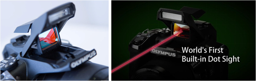 | SP-100 EE เป็นกล้องดิจิตอลตัวแรกในโลกที่พัฒนาใส่ระบบการตรวจหาตำแหน่งโฟกัสระยะไกลได้รวดเร็วไม่ต้องปรับระยะซูมใหม่ให้เสียเวลาด้วยการใส่ระบบ Dot Sight มีลักษณะเป็นแสงสีแดงปรากฎขึ้นที่แผ่นเล็งโฟกัสเมื่อผลักสวิทช์ให้ยกตัวขึ้นพร้อมแฟลชป๊อปอัพของกล้อง ซึ่งตำแหน่งของการยกตัวจะต้องมองลอดผ่านตรงกลางเล็งไปยังตำแหน่งวัตถุโดยไม่ต้องมองผ่านจอ LCD หรือช่องมอง EVF นี่เองเป็นที่มาของคำว่า EE ย่อมาจาก Eagle Eyes การเล็งด้วยระบบนี้มีความแม่นยำสูงในจุดนี้สามารถปรับระดับได้จากแป้นหมุนข้างจอ EVF และปรับระดับความสว่างได้ ตัวแฟลชสามารถสั่งให้ปิดหรือเปิดการทำงานได้อิสระ |