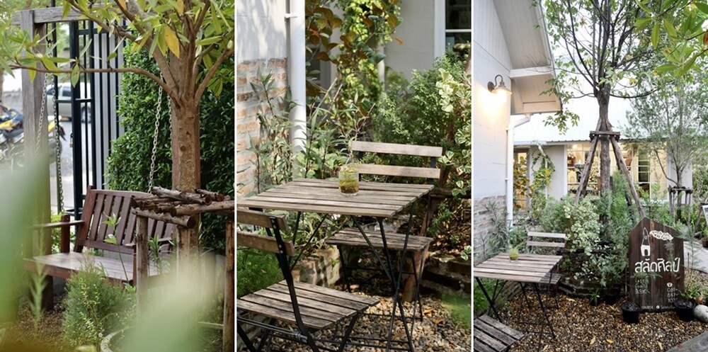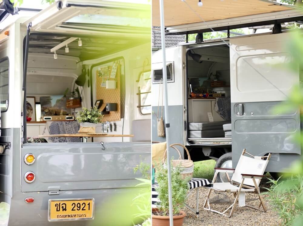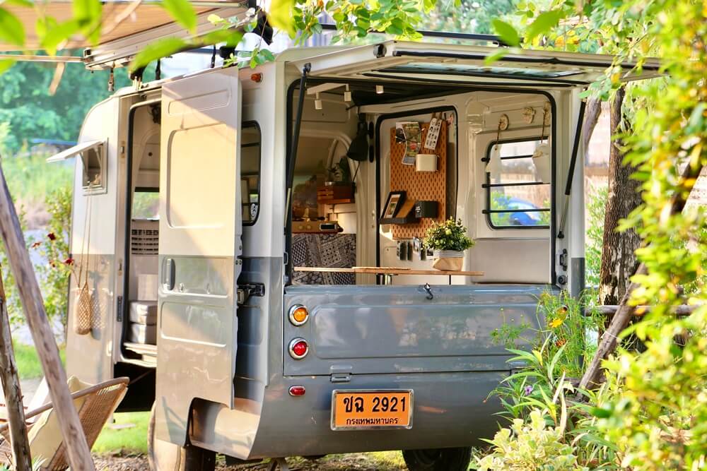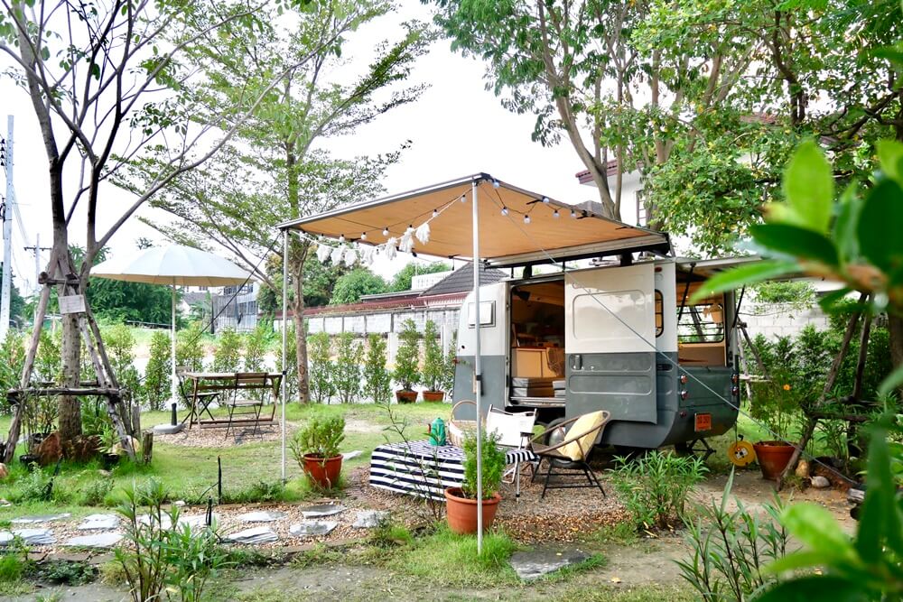 ภายนอกร้านจะมีการจัดรถบ้านน่ารักๆ ที่ตั้งอยู่กลางสวนร่มรื่น เป็นพร๊อพสำหรับการถ่ายรูปชิคๆ ให้เราอีกด้วย เป็นกิมมิคร้านที่ใครมาก็ต้องไม่พลาดที่จะมาถ่ายรูปในจุดนี้