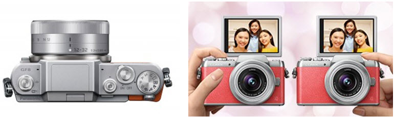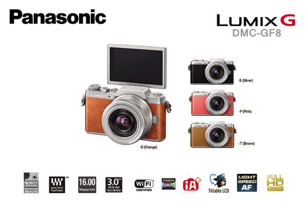 | PANASONIC LUMIX DMC-GF8 กล้องมิลเลอร์เลสรุ่นใหม่ที่ต่อยอดความสำเร็จจากรุ่น GF7 อย่างทันใจ แม้ดูภายนอกจะมีการออกแบบที่ไม่แตกต่างจากเดิมแต่ความโค้งมนตามขอบมุม และสีสันของตัวบอดี้มีการปรับเปลี่ยนให้ดูสวยงามมากยิ่งขึ้น ส่วนระบบการทำงานหลักมีการพัฒนาให้รวดเร็วตอบสนองการทำงานได้ดียิ่งขึ้น ซึ่งฟังก์ชั่นที่โดดเด่นจนไม่พูดถึงไม่ได้ นั่นคือ การถ่ายภาพบุคคลที่สามารถปรับหน้าจอ LCD ขนาด 3 นิ้วให้พลิกตั้งในมุม 180 องศาแล้วควบคุมผ่านระบบสัมผัสที่ด้านขวาของจอ โดยมีลูกเล่นในการตกแต่งใบหน้าให้ได้สนุกสนานก่อนจะกดชัตเตอร์ให้ภาพไปบันทึกเก็บในเมมโมรี่ แบบ SD(Secure Digital) ด้วยความละเอียดสูงสุดถึง16ล้านพิกเซล ผ่านการประมวลผลของ Venus Engine ที่เป็นลิขสิทธิ์เฉพาะของพานาโซนิค |