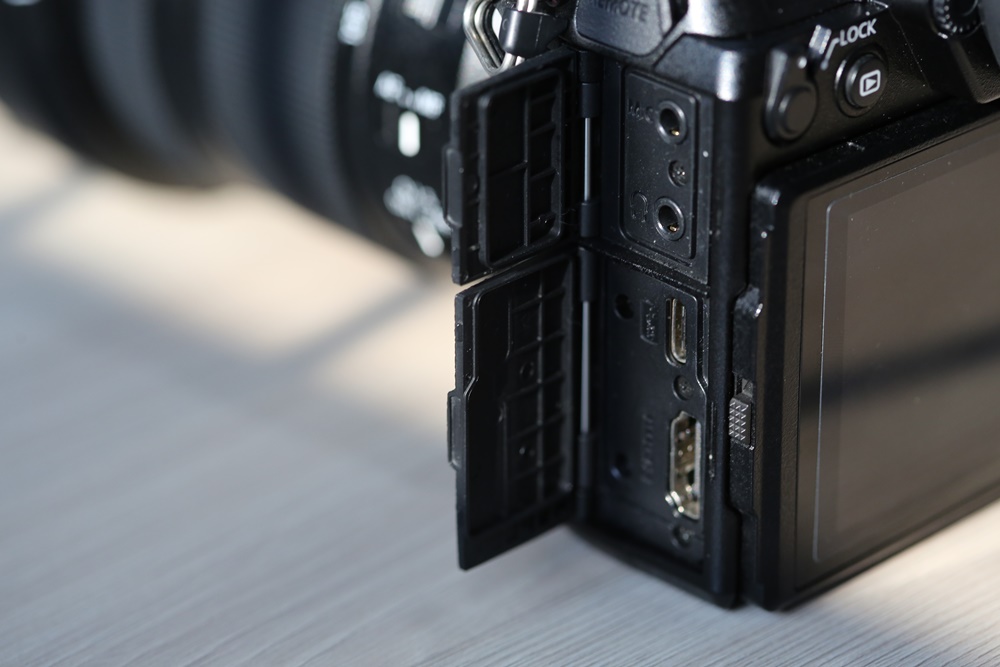 ด้านซ้ายของตัวกล้องจะเป็นพอร์ตสำหรับเชื่อมต่ออุปกรณ์สำหรับถ่ายทำทั้งหลายครับ โดยพอร์ตบนสุดจะเป็นพอร์ตสำหรับเสียบรีโมท
