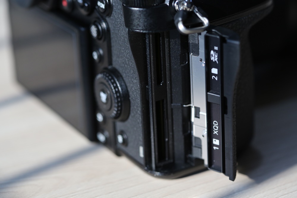 พลิกมาด้านข้างของฝั่งขวาตัวกล้อง ฝั่งนี้เป็นช่องใส่การ์ด รองรับทั้ง SD card (UHS-II) และ XQD card