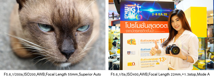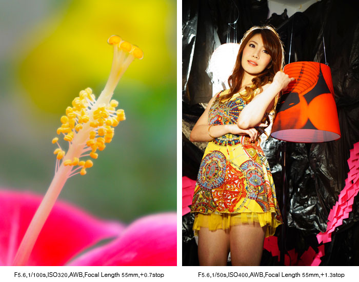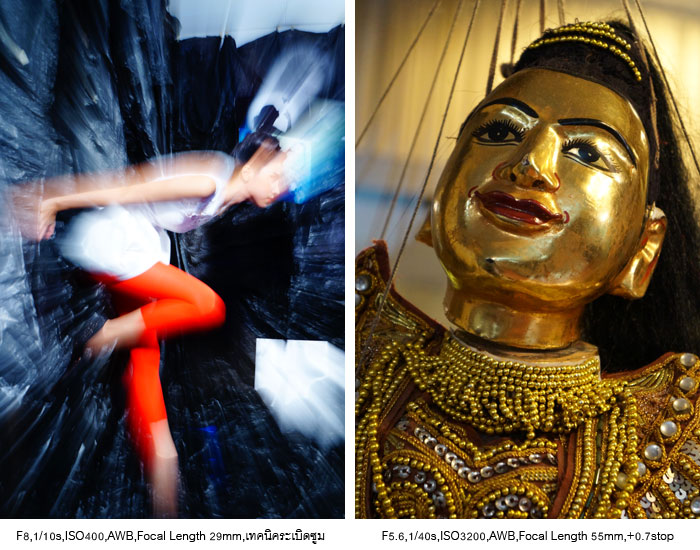 เทคโนโลยีของเซ็นเซอร์ช่วยให้การถ่ายภาพในสภาพแสงน้อยมีคุณภาพสูงขึ้นกว่าเดิมเป็นอันมากโดยรายละเอียดไม่สูญเสียไปจนมองไม่รู้เรื่องอันนี้เป็นสิ่งที่น่าทึ่งนอกจากนี้ยังสามารถใส่เทคนิคการถ่ายภาพลงไปได้เมื่อกล้องคำนวณความเร็วชัตเตอร์ไปต่ำกว่ากฎ1/ทางยาวโฟกัส ตัวอย่างภาพซ้ายที่ใช้เทคนิคระเบิดซูมเพื่อให้อารมณ์การพุ่งกระโจนระเบิดพลังออกมา ซึ่งต้องโฟกัสที่นางแบบไว้ก่อนจากนั้นจึงหมุนวงแหวนซูมออกไป ส่วนภาพด้านขวาบันทึกในสภาพแสงต่ำมากหากเป็นกล้องรุ่นเดิมๆคงให้สีทองเปล่งปลั่งออกมาไม่ได้เช่นที่เห็นในความไวแสงสูงถึง 3200 ในรายละเอียดของลูกปัดบริเวณเสื้อก็เช่นกันยังสามารถเก็บรายละเอียดไว้ได้แม้จะยังไม่คมกริบเหมือนในสภาพแสงดี แต่ก็ช่วยให้เราได้เก็บภาพนั้นๆไว้ได้ในคุณภาพที่ยอมรับได้
