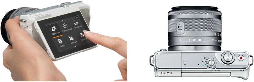 EOS M10 มีจอแสดงผลขนาดใหญ่ 3 นิ้ว ความละเอียด 1.04 ล้านจุดวางเต็มหลังกล้องจึงเพิ่มความสะดวกสบายในการควบคุมการทำงานของกล้องด้วยระบบทัชสกรีนมีการสนองตอบรวดเร็วปรับขึ้นลงได้ถึง 180 องศาเรียกว่าพับขึ้นตั้งตรงโดยไม่มีบอดี้หรือเลนส์มาบังจอเลย ด้านบนมีสามจุดไล่เรียงจากปุ่มนอกสุดสีแดง เป็นปุ่มกดเริ่มบันทึกภาพวิดีโอที่ให้ความละเอียดระดับ Full HD1080p /30fps ถัดมาเป็นปุ่มชัตเตอร์ และสุดท้ายที่เชื่อว่าจะมีหลายคนอาจสับสนว่าเปิดสวิทช์แล้วทำไมกล้องไม่ทำงาน ซึ่งอันที่จริงรุ่นนี้ใช้การกดปุ่มเพื่อเปิดเครื่องส่วนก้านโยกจะเป็นตัวเปลี่ยนโหมดการถ่ายภาพที่มีให้เลือก 3 โหมดไม่ต้องเข้าไปหาในเมนูให้งง