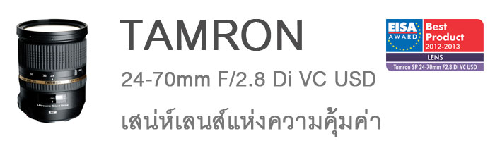 TAMRON 24-70mm F2.8 Di VC USD เลนส์ซูมไวแสงช่วงมาตรฐานเกรดโปรตัวแรกที่มีระบบป้องกันการสั่นไหว (Vibration Compensation) และมอเตอร์ระบบโฟกัสที่ทำงานได้เงียบมาก (Ultrasonic Silent Drive Motor) หน้าเลนส์จึงมีขนาด 82 มม. การออกแบบกระบอกเลนส์ดูหรูหราดุดันด้วยเส้นคาดสีทองมีสลักล็อกกระบอกซูมตามสไตล์แทมรอนเพื่อป้องกันซูมไหลเมื่อผ่านอายุการใช้งานไปนานๆเรียกว่าเผื่อไว้ให้เนื่องจากเลนส์รุ่นนี้ไม่ใช้ระบบInternal Focusเวลาเก็บจึงเสียพื้นที่น้อยกว่าเลนส์ค่ายทั้งNikon และCanonแต่น้ำหนักเรียกว่าสูสีกัน (825กรัม) เวลาประกอบกับบอดี้ให้ความรู้สึกมั่นคงดีมากขณะถือเดินถ่ายภาพ ยิ่งได้ระบบ VC หรือเรียกติดปากว่ากันสั่นมาช่วยยิ่งมีทางเลือกว่าจะปรับ ISO หรือจะปรับ Shutter Speed โดยตัวเลนส์จะมีฮูดทรงกลีบดอกไม้แถมมาให้ในกล่อง เพื่อป้องกันแสงแฟลร์ (Flare) และการกระแทกเลนส์จากด้านหน้า สำหรับระบบการโฟกัสที่ทางแทมรอนมั่นใจกับความแม่นยำนั้นนับว่าเชื่อถือได้เลย แม้จะมีความเร็วเป็นรองเลนส์ค่ายบ้างแบบเฉียดฉิวอันเป็นผลจากระบบการประมวลผล และระบบไฟฟ้าที่สั่งงานของค่ายจะรองรับสมบูรณ์กว่านั้นเอง (แต่ค่าตัวก็ต่างกันพอสมควร) สำหรับท่านที่ถ่ายภาพไม่เร่งรีบจุดนี้แทบจะไม่มีผลต่อการใช้งานเลย เนื่องจากสีสัน ความอิ่มตัว สวยงามจากการใช้เลนส์ชิ้นเลนส์พิเศษ LD (Low Dispersion) และชิ้นเลนส์ XR (Extra Refractive Index) 2 ชิ้น ทั้งหมดนี้ส่งผลให้เลนส์รุ่นนี้ มีคุณภาพสูง