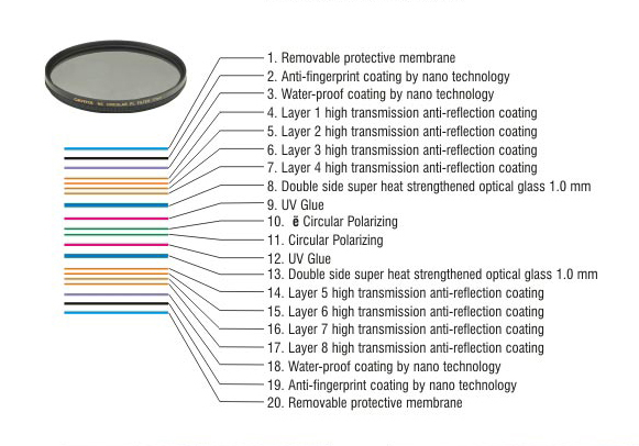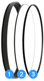 1.กรอบฟิลเตอร์มักทำจากวัสดุอลูมิเนียม อัลลอยด์ (Aluminium Alloy) 2.ชิ้นแก้ว เป็นหัวใจสำคัญในการปกป้องหน้าเลนส์ 3.เส้นวงแหวนยึดเลนส์ คอยประกบให้ชิ้นแก้ว กับกรอบไม่แยกจากกัน |
