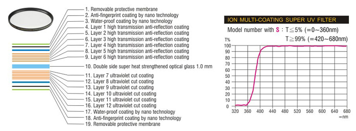 ตัวอย่างแสดงการเคลือบผิว และอัตราการผ่านของแสง(Transmittions)ของฟิลเตอร์ประเภทปกป้อง