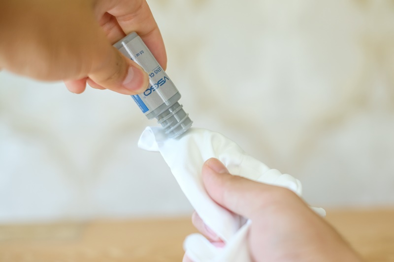 จากนั้นให้นำผ้าไมโครไฟเบอร์มาพันนิ้วชี้ไว้ และหยดน้ำยาเช็ดเลนส์ VSGO ลงบนนิ้วที่พันผ้าไมโครไฟเบอร์ไว้ครับ แล้วค่อยนำมาถูกับหน้าเลนส์ แบบวนๆอีกครั้ง และเช็ด