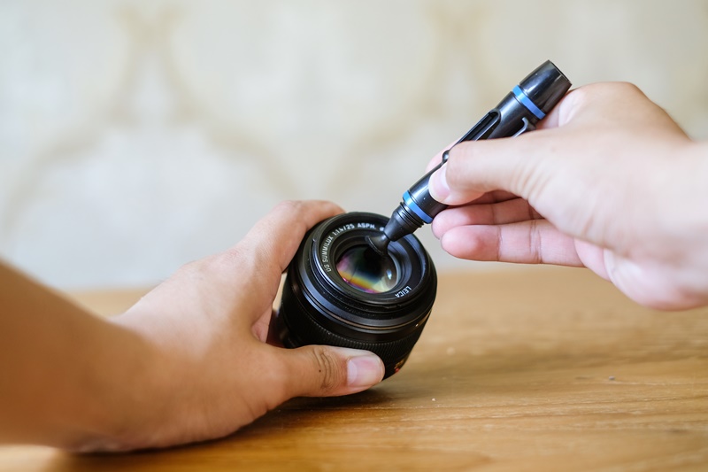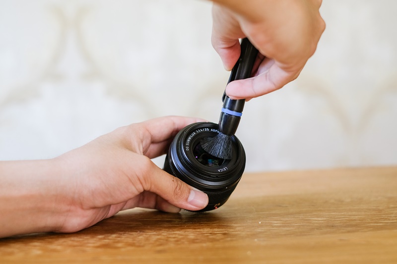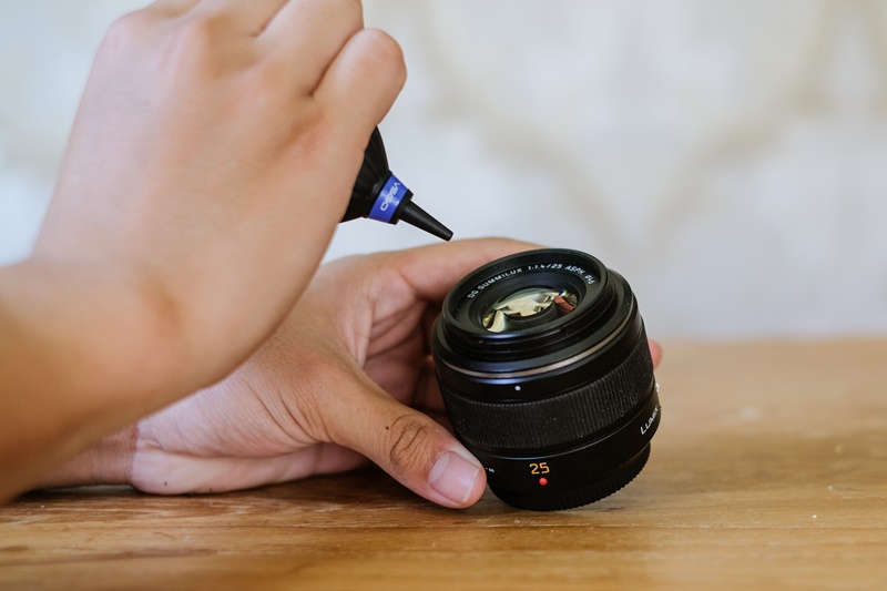 ใช้ลูกยางเป่าลมลงบนหน้าเลนส์ แนะนำให้เป่าจากด้านข้างของเลนส์ ไม่ใช่เป่าตรงหน้าเลนส์นะครับ แค่ให้ฝุ่นกับเศษทรายออกไปครับ