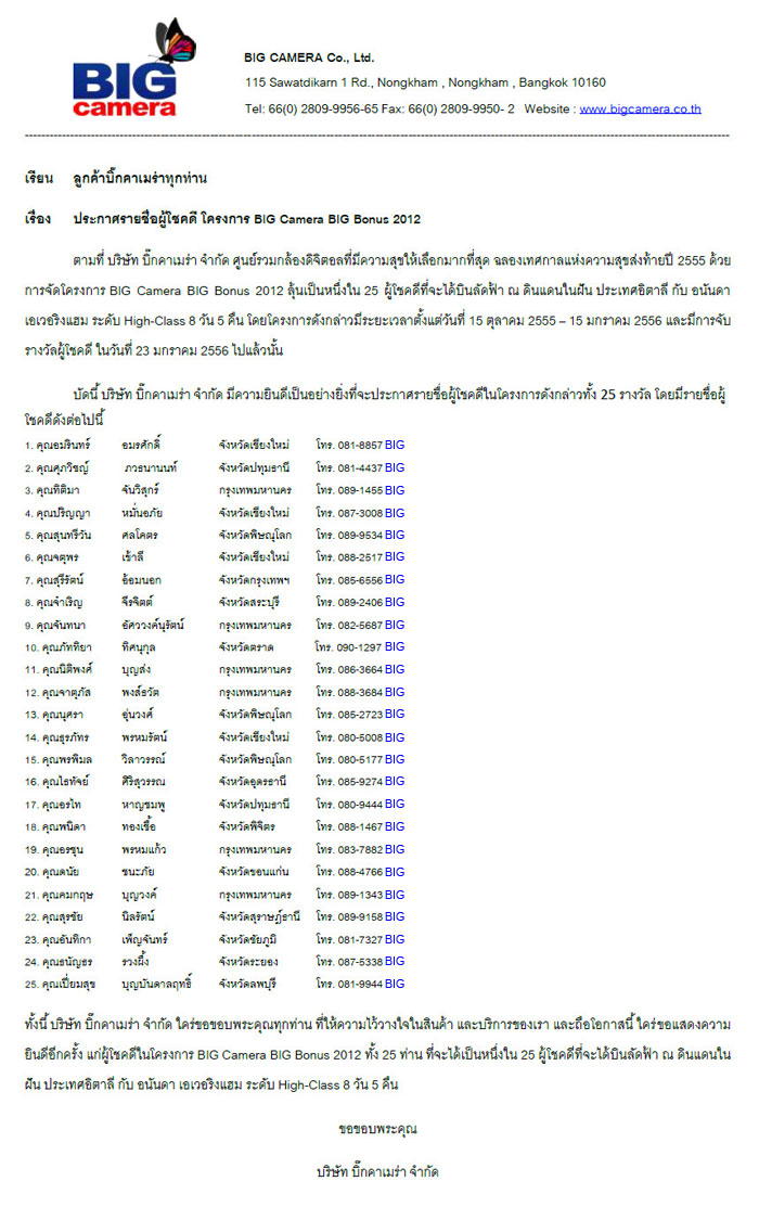 ประกาศรายชื่อผู้โชคดี แคมเปญ BIG Camera BIG Bonus 2012 ฉลองยิ่งใหญ่ทั้ง 200 สาขาทั่วประเทศ