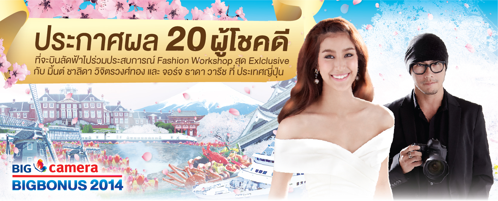 | ตามที่ บริษัท บิ๊ก คาเมร่า จำกัด ศูนย์รวมกล้องดิจิตอลที่มีความสุขให้เลือกมากที่สุด ฉลองเทศกาลแห่งความสุขส่งท้ายปี 2014 ด้วยการจัดแคมเปญ BIG Camera BIG Bonus 2014 เพื่อลุ้นหา 1 ใน 20 ผู้โชคดี ที่ได้รับรางวัล ทริปท่องเที่ยวถ่ายภาพระดับ High Class ณ เกาะคิวชู ประเทศญี่ปุ่น พร้อมร่วมเปิดประสบการณ์ครั้งสำคัญกับ Fashion Workshop สุด Exclusive โดยช่างภาพระดับ Top Class ของเมืองไทย คุณจอร์จ ธาดา วารีช และ มิ้นต์ ชาลิดา วิจิตรวงศ์ทอง จำนวน 1 รางวัล ซึ่ง BIG Camera ได้ทำการปิดรับคูปองจากทุกสาขา เมื่อวันที่ 15 มกราคม 2558 และมีการจับรางวัลผู้โชคดี ในวันที่ 27 มกราคม 2558 |