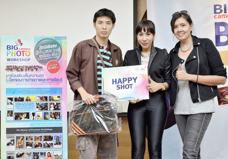 | คุณนิวรรณ เตือนใจยา ผู้จัดการฝ่ายการตลาด บริษัท บิ๊ก คาเมร่า จำกัด(ที่สองจากขวา) และคุณพีช – กาซาลอง คำจริง วิทยากร (ขวา) ร่วมถ่ายภาพแสดงความยินดีให้กับ คุณพงศ์วรุตม์ แสงสุรินทร์ ผู้ชนะเลิศการประกวดภาพรางวัล THE HAPPY SHOT(ซ้าย) |