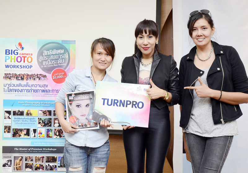 | คุณนิวรรณ เตือนใจยา ผู้จัดการฝ่ายการตลาด บริษัท บิ๊ก คาเมร่า จำกัด(ที่สองจากขวา) และคุณพีช – กาซาลอง คำจริง วิทยากร (ขวา) ร่วมถ่ายภาพแสดงความยินดีให้กับ คุณดวงแข บุตรวงศ์ ผู้ชนะเลิศการประกวดภาพรางวัล TURN PRO (ซ้าย) |