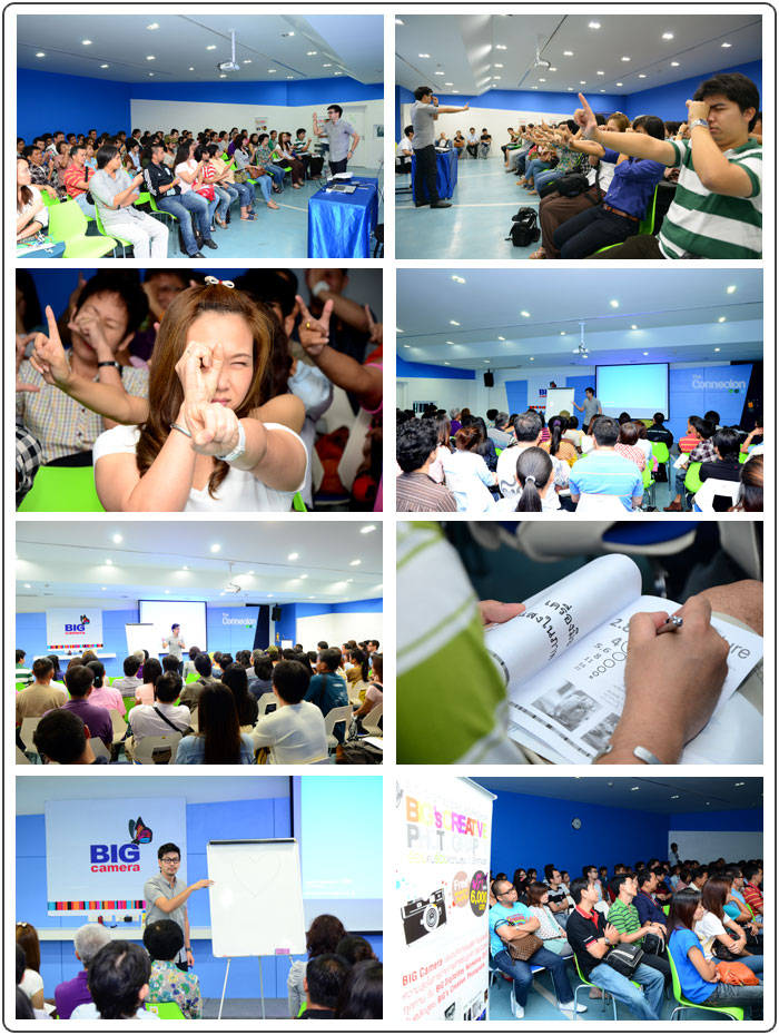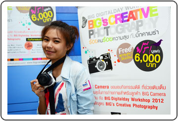 ผ่านไปแล้วกับกิจกรรม BIG DIGITAL DAY WORKSHOP 2012 ครั้งที่ 9 วันที่ 16 กันยายน 2555 ภายใต้หัวข้อ BIG’S CREATIVE PHOTOGRAPHY โดย อ.ตุลย์ หิรัญญาลาวัลย์ กรรมการบริหารสมาคมถ่ายภาพแห่งประเทศไทย ในพระบรมราชูปถัมภ์ เวิร์คช็อปเพื่อฝึกทักษะการใช้งานกล้องดิจิตอลให้กับกลุ่มลูกค้าของทางร้านที่ BIG Camera จัดขึ้น ภายใต้บรรยากาศ Refreshment ซึ่งจะเติมเต็มความสุขในการถ่ายภาพแก่ลูกค้าคนพิเศษของเรา และก่อให้เกิดจิตนาการได้อย่างไม่มีที่สิ้นสุด กับสถานที่ใหม่ที่บรรจุ ความสุขได้มากขึ้นกับ " The Connecion Educusine"