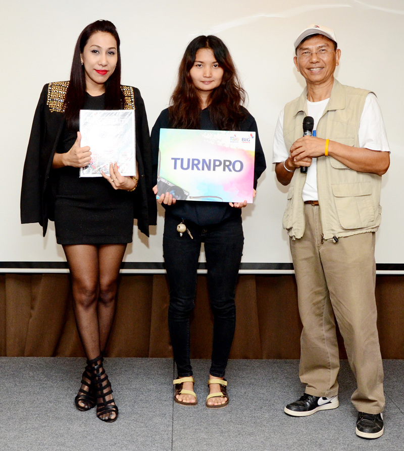 | คุณณิชพน วงค์จันทร์ติ๊บ ผู้ชนะเลิศการประกวดภาพรางวัล TURN PRO(ขวา) โดยมี คุณนิวรรณ เตือนใจยา ผู้จัดการแผนกการตลาด บริษัท บิ๊ก คาเมร่า จำกัด (ที่สองจากซ้าย) และ อาจารย์สงคราม โพธิ์วิไล วิทยากร (ซ้าย) ร่วมถ่ายภาพแสดงความยินดี |