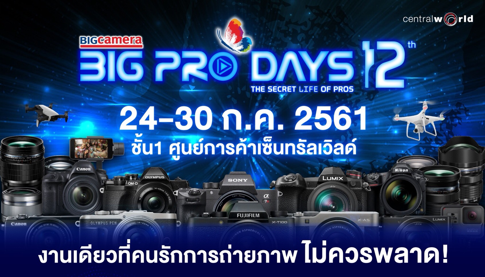 บิ๊ก คาเมร่า ศูนย์รวมกล้องดิจิตอล ที่มีความสุขให้เลือกมากที่สุด จัดยิ่งใหญ่ฉลอง 12 ปี ที่สุดแห่งมหกรรมกล้องดิจิทัลของเมืองไทย “บิ๊ก คาเมร่า บิ๊ก โปร เดย์ 2018” (BIG CAMERA BIG PRO DAY 2018) โดย บริษัท บิ๊ก คาเมร่า คอร์ปอเรชั่น จำกัด (มหาชน) กับคอนเซ็ปต์ “เดอะ ซีเคร็ท ไลฟ์ ออฟ โปร” (The Secret Life of Pros) ร่วมไขความลับแห่งความสำเร็จของเหล่าเทพในวงการกล้องดิจิทัลเมืองไทย พร้อมสัมผัสนวัตกรรมและเทคโนโลยีแห่งการถ่ายภาพสำหรับมืออาชีพ จากแบรนด์กล้องและอุปกรณ์ชั้นนำของโลก อาทิ FUJIFILM, SONY, OLYMPUS, PANASONIC, CANON, NIKON, CASIO, PENTAX, RICOH, THETA, SIGMA, TAMRON, GORPO, DJI, ZHIYUN, HERRINGBONE, OSKA, FUJIFILM INSTAX, POLAROID, INSTA360, LAOWA, SAMYANG, MITAKON, VANGUARD, FOTOPRO, PEAK DESIGN, SLIK, NISSIN, KENKO, KAMERAR, HOYA, NISI, SANDISK, TOSHIBA, LENSPEN, SARAMONIC, AZDEN ยกขบวนมาจัดโปรโมชั่นสุดพิเศษด้วยส่วนลดสูงสุด 50% รับเงินคืนสูงสุด 18,000 บาท ผ่อน 0% นานสูงสุด 36 เดือน และรับสิทธิ์เข้าร่วมกิจกรรมเวิร์คช้อปแบบเอ็กซ์คลูซีฟ “BIG CAMERA PHOTO WORKSHOP” ฟรี มูลค่ากว่า 20,000 บาท และของแถมพิเศษอีกมากมาย