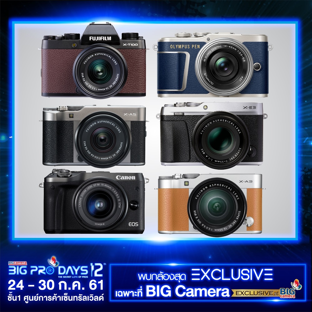พบกล้อง EXCLUSIVE เฉพาะที่ BIG CAMERA เท่านั้น! Fujifilm X-T100 Brown, Olympus Pen E-PL9 Denim Blue, Fujifilm X-A5 Dark Silver, Fujifilm X-E3 Kit 35mm. F1.4 R, Canon EOS M6, Fujifilm X-A3 Camel Brown และอีกมากมายหลากหลายแบรนด์ดังที่พร้อมใจยกขบวน กล้องดิจิตอลและอุปกรณ์ชั้นนำ ที่กำลังฮิตติดกระแสอยู่ในขณะนี้ ที่มาพร้อมโปรโมชั่นสำหรับผู้ที่คลั่งไคล้ในการถ่ายภาพ สิทธิพิเศษเฉพาะในงานเท่านั้น!!!
