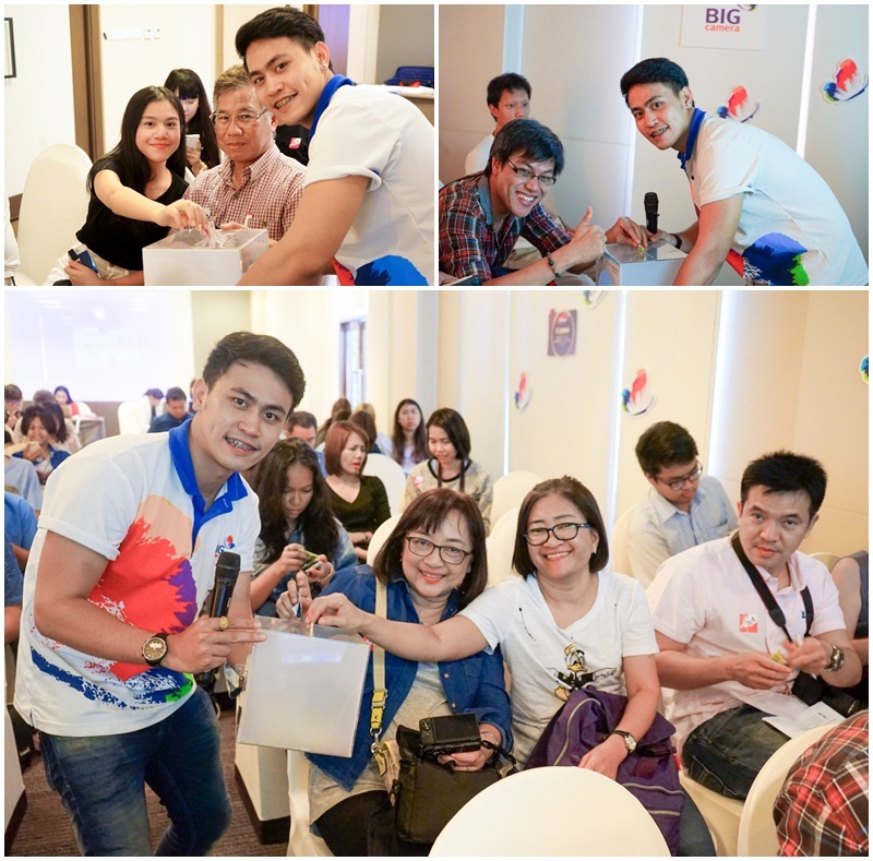 | คุณพีท - กาซาลอง คำจริง วิทยากร (ซ้าย) และ คุณนิวรรณ เตือนใจยา ผู้จัดการแผนกการตลาด และการสื่อสารองค์กร บริษัท บิ๊ก คาเมร่า คอร์ปอเรชั่น จำกัด (มหาชน)(ที่สองจากขวา) ร่วมถ่ายภาพแสดงความยินดีให้กับ คุณภัทรพิร์ สมบัติวงศ์ ผู้ชนะเลิศรางวัล Fan Shot (ขวา) |