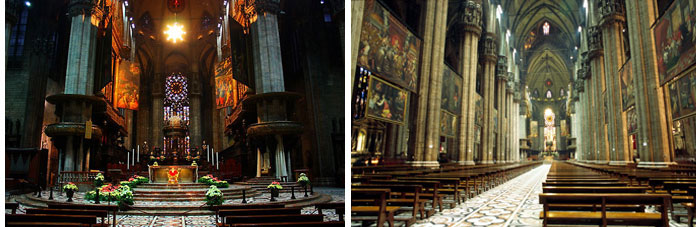 “มหาวิหารดูโอโม่” มีการประดับประดาไปด้วยรูปปั้นกว่า 3,200 รูปที่สวยงาม และมียอดรวม 135 ยอด จนได้รับฉายาว่า “วิหารเม่น” ความโดดเด่นของดูโอโมอยู่ที่ยอดแหลมบนหลังคา บนยอดใหญ่ตรงกลางมีพระรูปแม่พระทำด้วยทองสัมฤทธิ์ขนาดความสูง 4 เมตร ซึ่งเรียกกันว่ามาดูนีนา (Madunina) เป็นแม่พระผู้คุ้มครองเมืองมิลาน และถือว่าเป็นสิ่งสูงที่สุด ดังนั้นในมิลานเมื่อมีการก่อสร้างตึกที่สูงกว่าพระแม่ ก็จะมีการทำรูปจำลองของพระแม่ไปประทับที่ยอดตึกด้วย ภายในและภายนอกประดับประดาไปด้วยรูปปูนปั้นของนักบุญและเรื่องราวจากพระคัมภีร์ นอกจากนั้นประดับด้วยภาพเขียน และสเตนกราสที่หน้าต่างสีสันสวยงามมาก สามารถบรรจุคนได้ประมาณถึง 40,000 คน