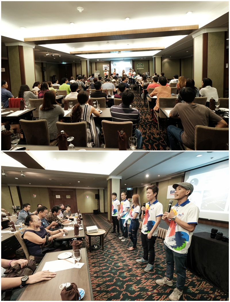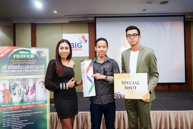 | คุณสุธีกร สุรฤทธิ์เดชาชัย (ที่สองจากซ้าย) ผู้ชนะเลิศการประกวดภาพรางวัล Fan Shot โดยมี คุณนิวรรณ เตือนใจยา ผู้จัดการแผนกการตลาดและสื่อสารองค์กร บริษัท บิ๊ก คาเมร่า คอร์ปอเรชั่น จำกัด (มหาชน)(ซ้าย) และ คุณแทม พศิน อัธยาตมวิทยา วิทยากร(ขวา) ร่วมถ่ายภาพแสดงความยินดี |
